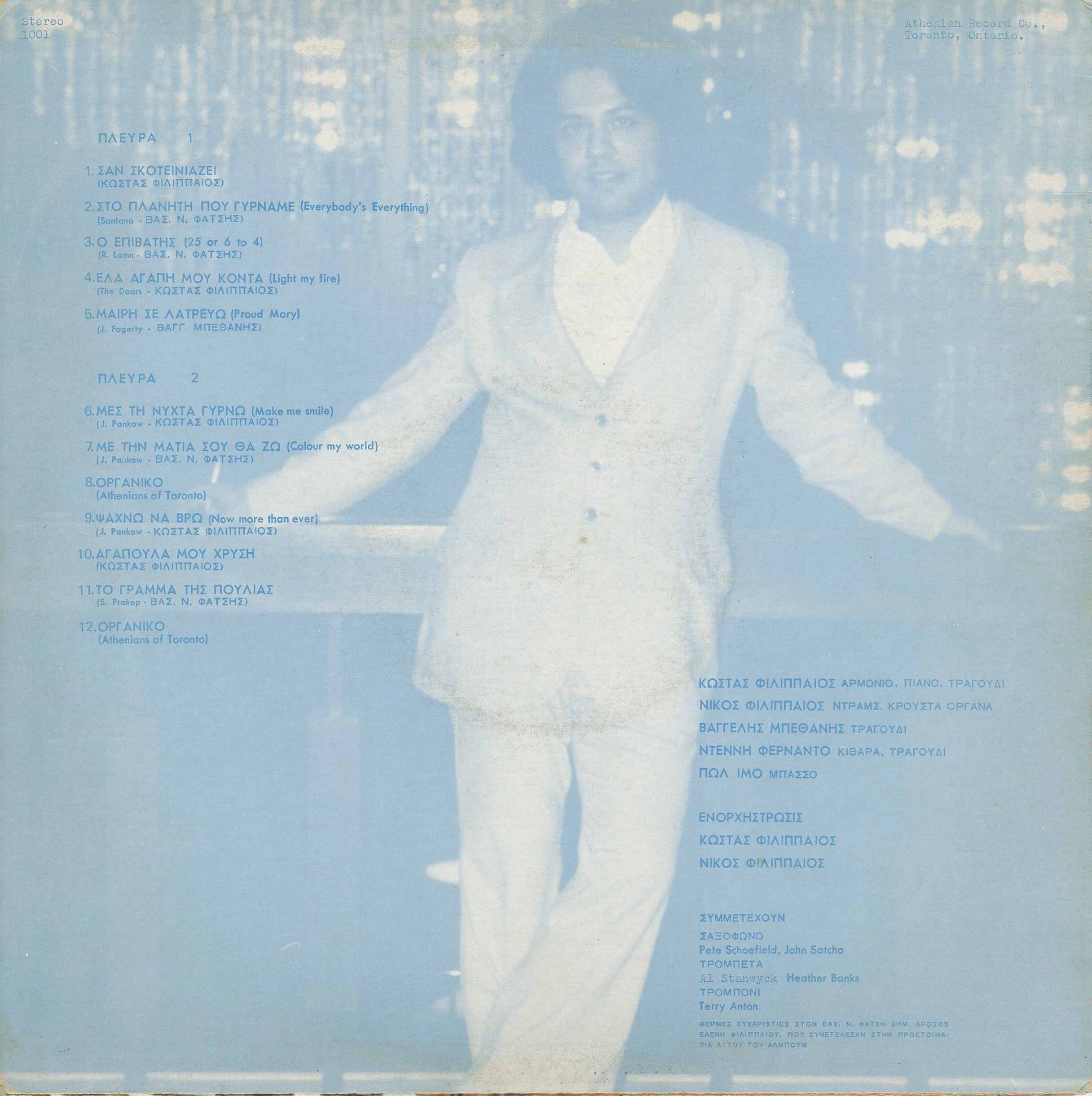 All of the songs are in Greek, except Light My Fire which switches over to English half-way through. The Athenians of Toronto were Denny Fernando on guitar and vocals; Vangelis Bethanis on vocals; Paul Imo on bass; Nikos Philippeos on drums; and Costa Philippeos on keyboards and vocals. I don’t believe any of these Greeks went on to record anything else, but the band was joined by a few more famous Canadian jazz musicians on horns, Pete Schoefield, John Satcho, Al Stanwyck, Heather Banks, and Terry Anton.