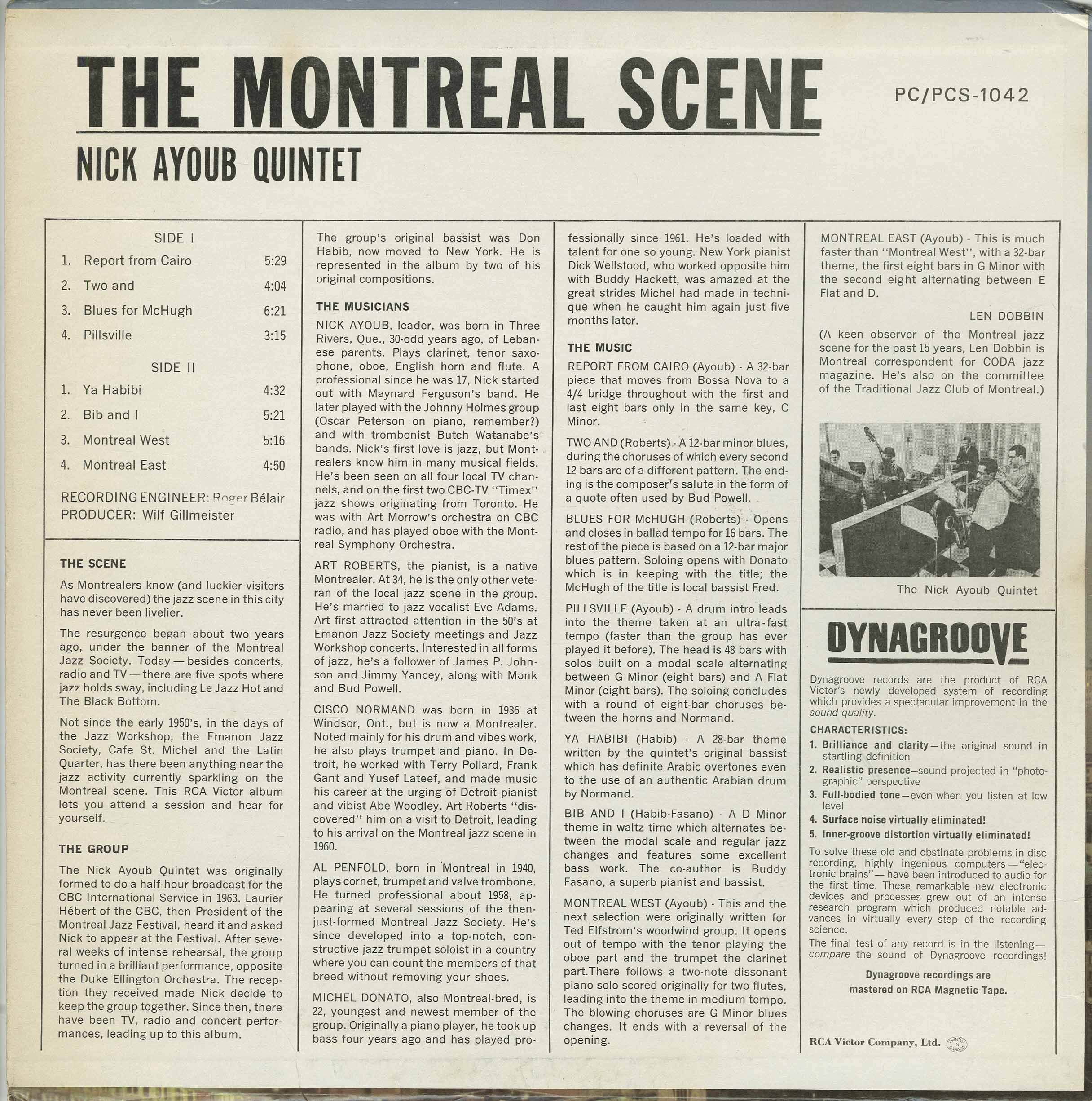 In 1964, he assembled the Nick Ayoub Quintet for a CBC International Service broadcast, which led to a high-profile performance at the Montreal Jazz Festival and the group’s landmark album The Montreal Scene (RCA Victor, 1964). Featuring Art Roberts, Al Penfold, Michel Donato, and Cisco Normand, the record captured the sophistication and vitality of Quebec’s resurgent jazz community. Ayoub’s compositions from the album—including “Report from Cairo,” “Ya Habibi,” and “Pillsville”—reflect his global influences and modal sensibility.