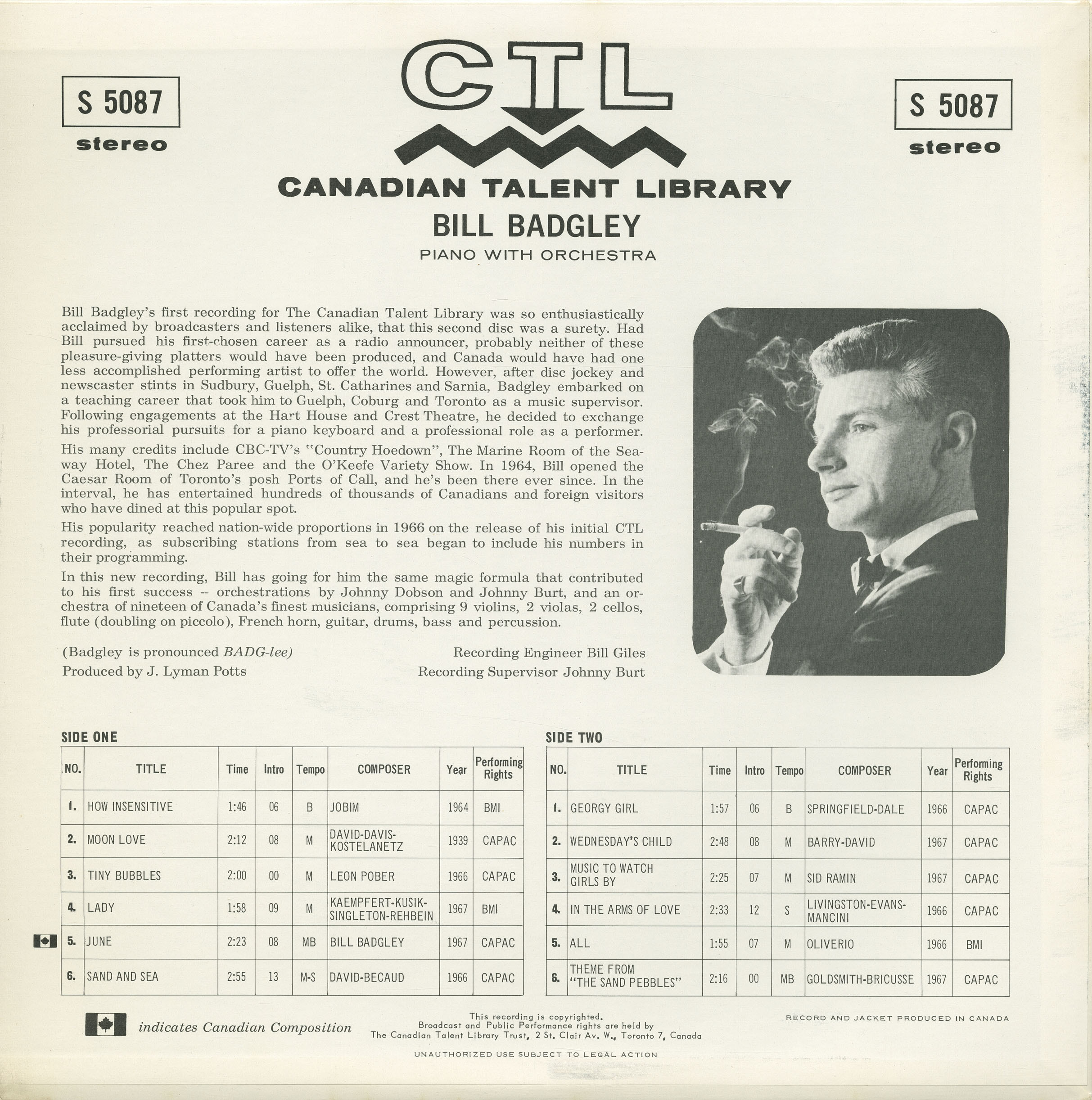 In this new recording, Bill has going for him the same magic formula that contributed to his first success — orchestrations by Johnny Dobson and Johnny Burt, and an orchestra of nineteen of Canada’s finest musicians, comprising 9 violins, 2 violas, 2 cellos, flute (doubling on piccolo), French horn, guitar, drums, bass and percussion.