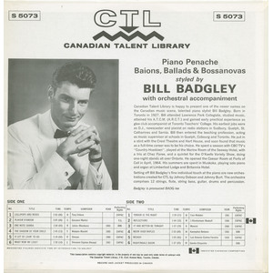 Canadian Talent Library is happy to present one of the newer names on the Canadian music scene, talented piano stylist Bill Badgley. Born in Toronto in 1927, Bill attended Lawrence Park Collegiate, studied music, attained his A.T.C.M. (A.R.C.T.) and gained early practical experience as glee club accompanist at Toronto Teachers’ College. His earliest jobs were as D.J., newscaster and pianist on radio stations in Sudbury, Guelph, St. Catharines and Sarnia. Bill then entered the teaching profession, acting as music supervisor at schools in Guelph, Cobourg and Toronto. He put in a stint with the Crest Theatre and Hart House, and soon found that music as a full-time career was to be his choice. He spent a season with CBC-TV’s “Country Hoedown”, played at the Marine Room of the Seaway Hotel, with a trio at Chez Paree, and a quintet for the O’Keefe Variety Show, doing one-night stands all over Ontario. He opened the Caesar Room at Ports of Call in April, 1964. His summer stints in Muskoka, playing solo piano and organ at Limberlost Lodge and Britannia Hotel.