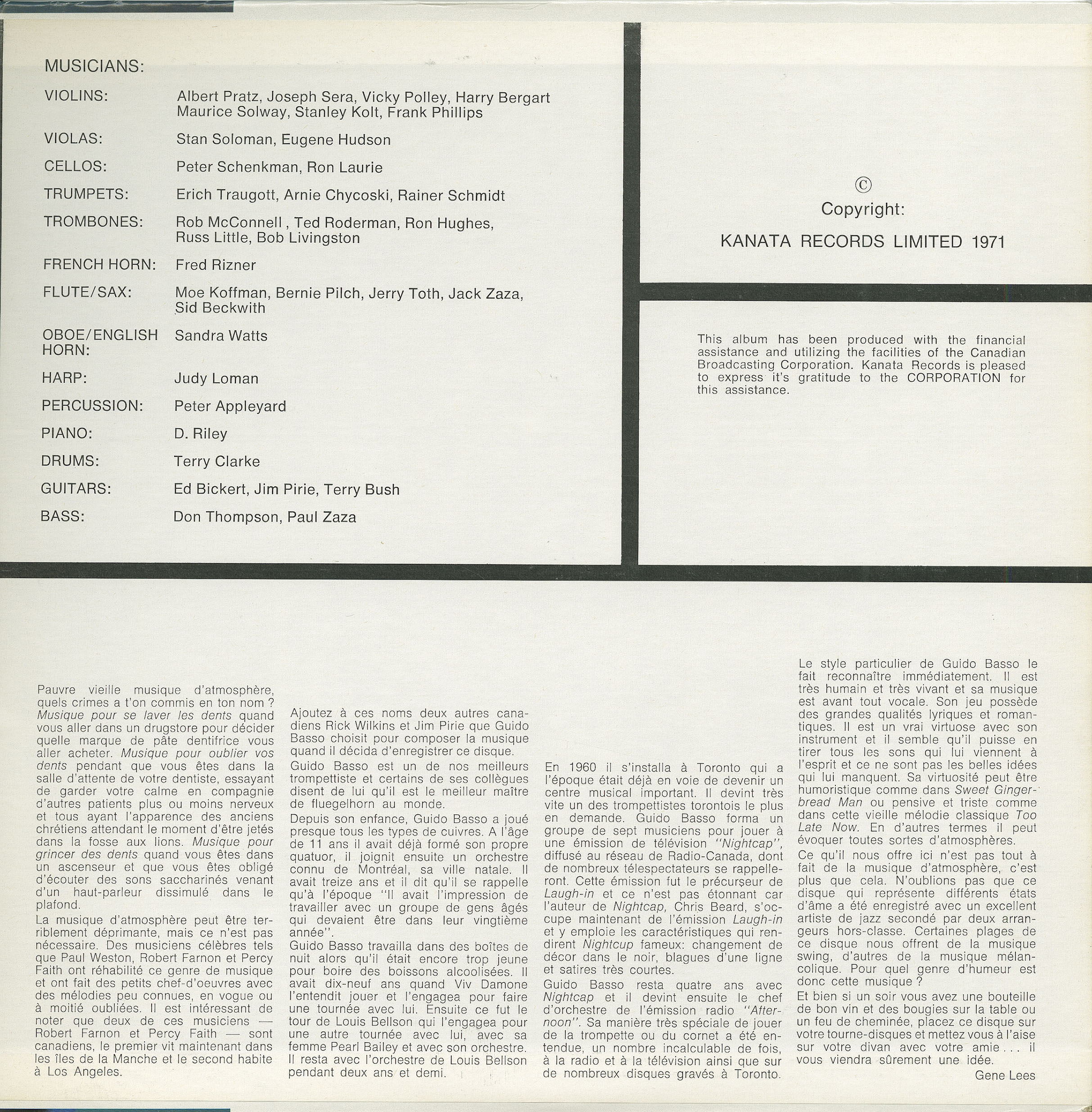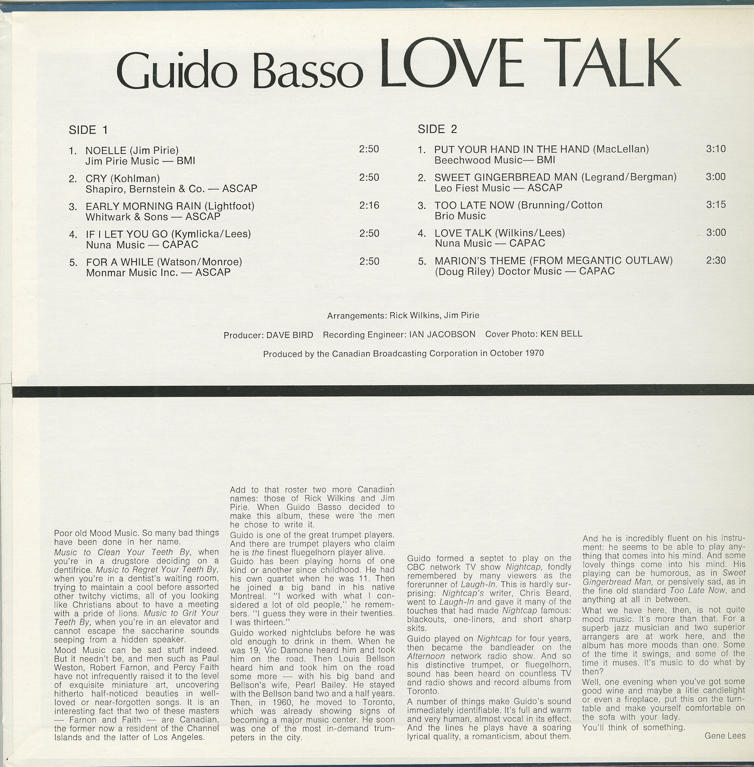 Ajoutez à ces noms deux autres canadiens : Rick Wilkins et Jim Pirie que Guido Basso choisit pour composer la musique quand il décida d’entreprendre ce disque. Guido Basso est un de nos meilleurs trompettistes et certains de ses collègues disent qu’il est même le meilleur trompettiste de fugelhorn au monde.