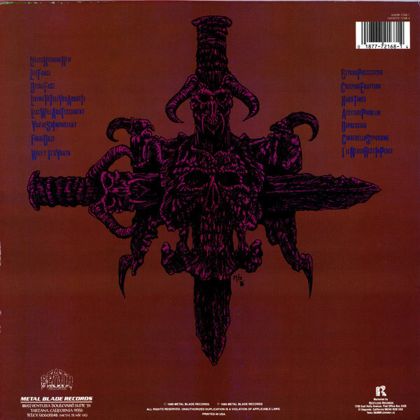 Special thanks to: Brian (Slats) Slagel, Bil (Rockin' Gus Onion) Metoyer, B. Ware, Mofo, and everyone at Thrasher Magazine and Deuxe. Ken and Sandra at the Record Store. Beth (for giving greatly). Cal (3 a.m.) Tire. Sean Holowaychuk (for the killer T-shirts). Adam Bomb. Ox and Carcass Bews. Whale Unit. Huckster. Dave Westlake (from the beginning to...). Rick (for the killer axe). Johnny Cruse Drum Shop. Arlene, Angie, Cheryl, (for their support, emotional and financial). Barb Carter. The "Hags". Robyn, Fred, and Rick. Jim C. Bomber. Kevin Mitchell R.I.P.