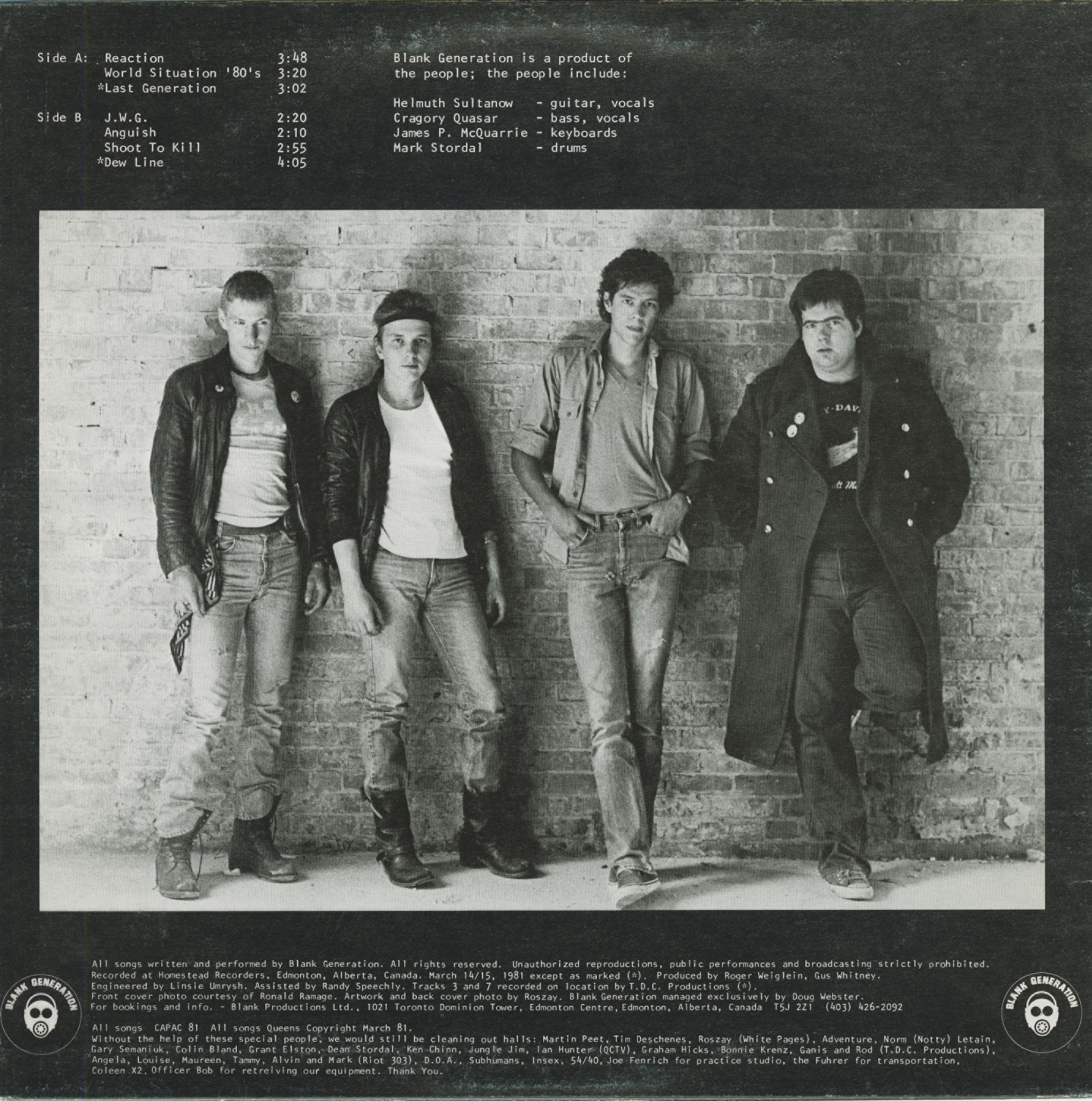 Though short-lived, Blank Generation’s contribution to Edmonton and Western Canada’s punk movement was profound. They were not only one of the region’s first all-original punk bands but also tireless promoters who created the infrastructure for a scene where none had existed. Their lone record, The Last Generation, remains a testament to their role as both musicians and scene-builders — raw, inventive, and inseparable from the community they helped spark.