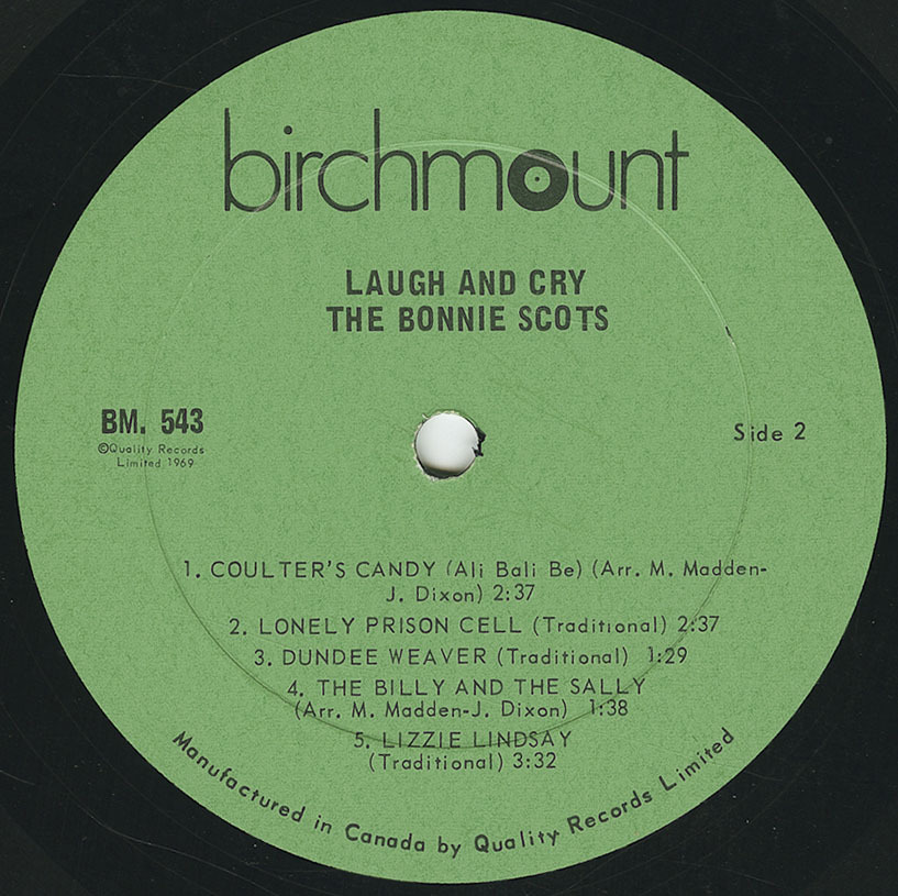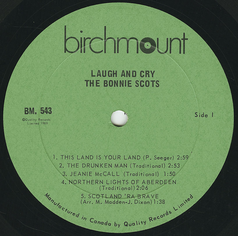 The good-humoured "Ranger's and Celtic" rivalry of the boys creeps into the old ballad "All Bali Be". Liberties are also taken with "Scotland 'Ra Brave" which, according to Mick and Jackie, is the "land of Pakistannis, Andy Capps and Setterday Sannies…" But enough of this blethering. Stick the record on and "Laugh and Cry" with THE BONNIE SCOTS.