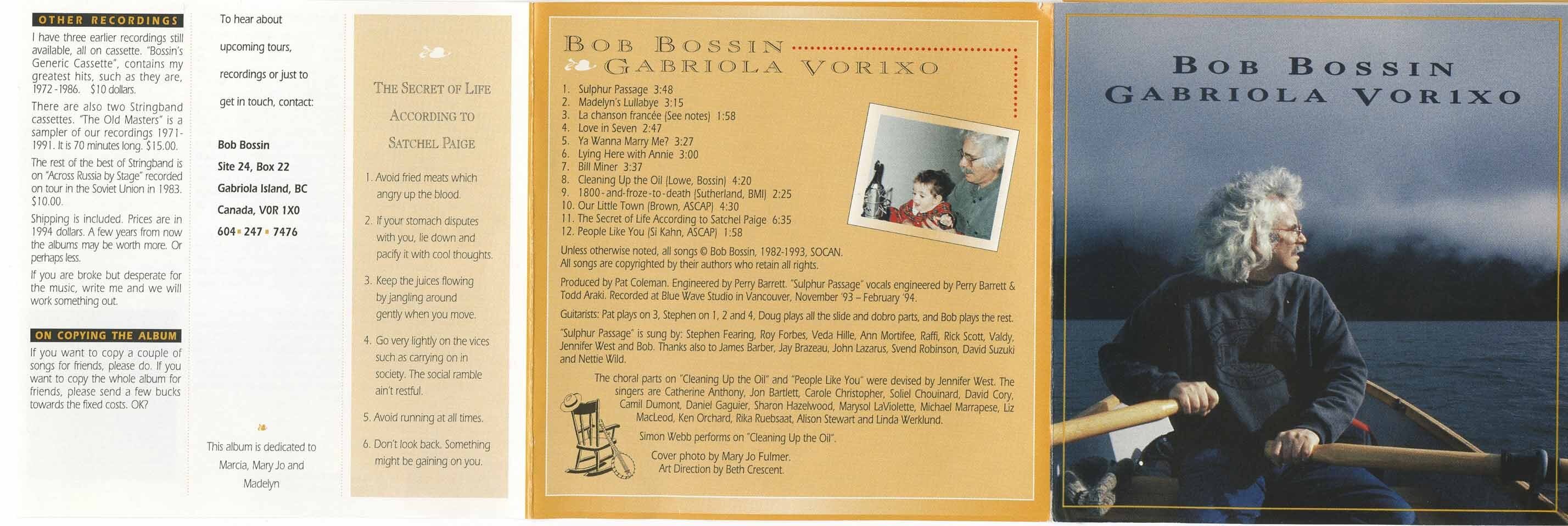 At 50, Bob Bossin refers to himself as "Old Folksinger," and to be truthful, he has been around for quite a long time. If you haven't been paying attention in recent years you could have imagined that he was just starting his career, but he's actually been around as long as fellow Canadian Gordon Lightfoot. Gabriola V0R1X0 is his first album in fifteen years and is the product not only of a folk-music master but also of the angels -- hundreds, perhaps thousands of them -- who helped Bob secure the funding to produce it. The details of how it all happened are carefully documented in March/April, 1996, issue of Sing Out! if you want to know more. But that is truly another story.
