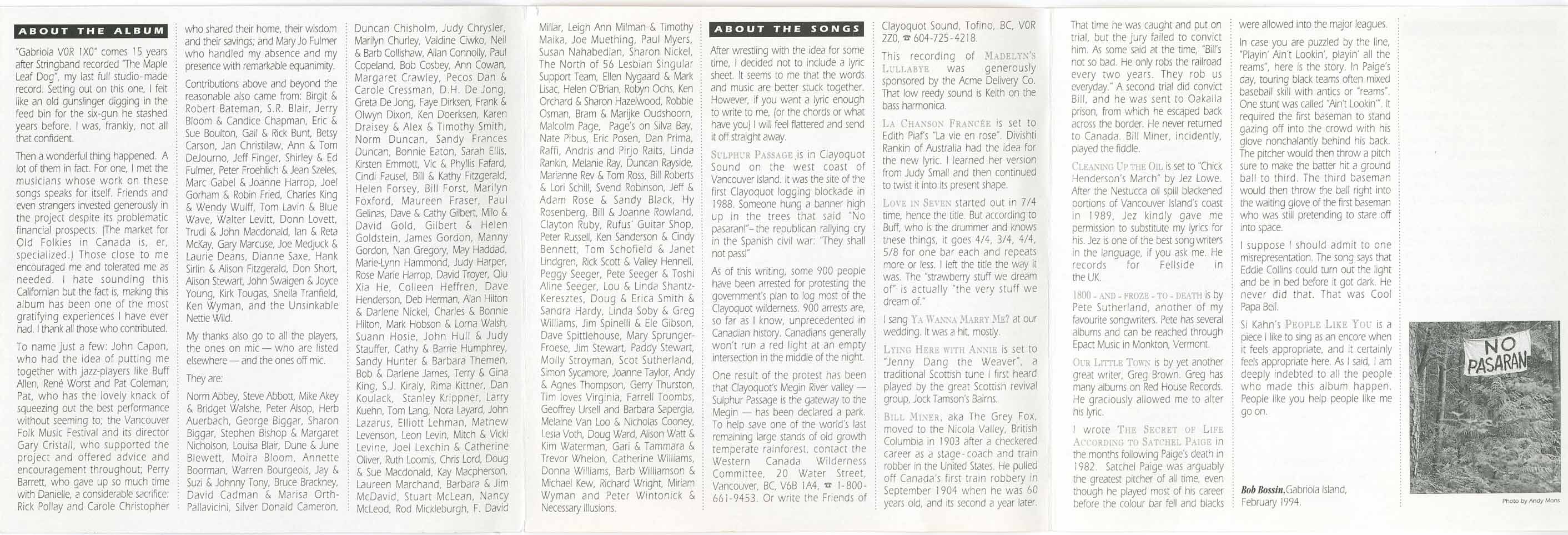 There are many good songs, but I can mention only a few. The opening track, "Sulphur Passage," still gives me chills several months after first hearing it. Borrowing the rallying cry "No Pasaran" from the Spanish Civil War, the song recounts the 1988 Clayoquot logging blockade. The vocalists on this track include Roy Forbes, Veda Hille, Ann Mortifee, Raffi, Rich Scott, Valdy, Jennifer West, and Bob Bossin. "Ya Wanna Marry Me?" was a song sung at Bob's wedding -- and rather well received, we understand. "Lying Here With Annie" is set to a traditional Scots tune and depicts life on Gabriola Island. Bob does a fine rendition of Pete Sutherland's "1800-and-froze-to-death," and he covers Greg Brown's "Our Little Town" quite capably. "The Secret of Life According to Satchel Paige," about the man who many feel was the greatest pitcher of all time, was written not long after Paige's death in 1982. The album closes with Si Kahn's "People Like You," a song that Bob often uses as an encore and one he says seems to work pretty well right here. I agree.