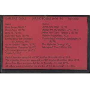 Ear Rational contains all the single voice pieces i composed in the years 1970 thru 1980 other than sections of The Martyrology Bk V & a part of the May Day Book. In addition i have included: a live recording of the only seven voice piece I've done, Acres Rare Meet; an alternate version of Dada Lama, previously unreleased; the first adequate realization of my composition Cosmic piece for Orchestra & Chorus; and the only remaining unrecorded single voice text from the 60's - Ballads Of The Restless Are. In the seventies I put the bulk of my energy in sound into composing for & with the Four Horsemen. In the single voice pieces the interest began to shift toward the more narrative & prose-based concerns evident in the most recent compositions on this tape, Interupted Nap & Art In Upheaval. This cassette is dedicated to Steve McCaffery, my partner in the C rimes in both the Toronto Research Group & the Four Horsemen. bpNichol, Toronto, January 1982