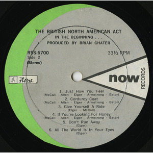 The British North-American Act formed in Montréal, Québec in 1968 and shortly thereafter they recorded an album of all original material "In The Beginning...", their only album, on Now Records in 1969. It was accompanied by the single "The World Will Understand b/w Joe Cool" on Now Records RS 600. The British North-American Act were Andy Bator, born in Hungary on February 20th, 1947 on organ and piano; Bob Allen, born in Montreal on July 3rd, 1946 on lead guitar; Dave McCall, born in Suffolk, England on November 11th, 1948 on drums; Rick Elger, born in Liverpool, England on rhythm guitar, harmonica and lead singer; and Kirk Armstrong, born in Montreal on June 20th, 1946 on bass.
