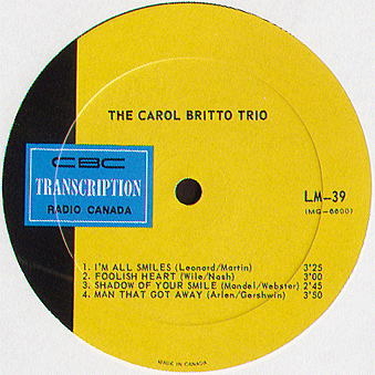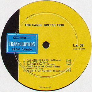 Carol was famous as a solo performer and as leader of the Carol Britto Trio. During her career, she accompanied legendary names in jazz including Chet Baker, Benny Carter, Helen Humes, Joe Williams, Major Holley, Zoot Sims, Phoebe Snow, Joe Venuti, Doc Cheatham, Marvin Stamm, Roy Eldridge, Flip Phillips, Bobby Rosengarden, Eddie "Lockjaw" Davis, Gary Mazzaroppi, Milt Jackson, Lance Hayward, Tootsie Bean, and Michael Moore. She played with Percy Faith and his Orchestra and she also toured with the Tommy Dorsey Band.