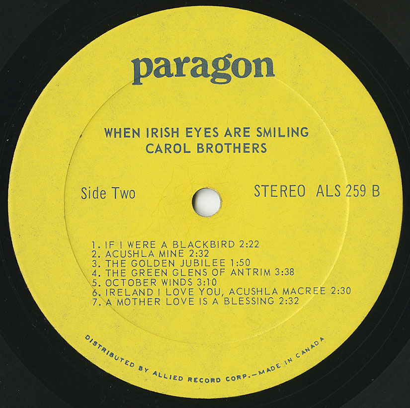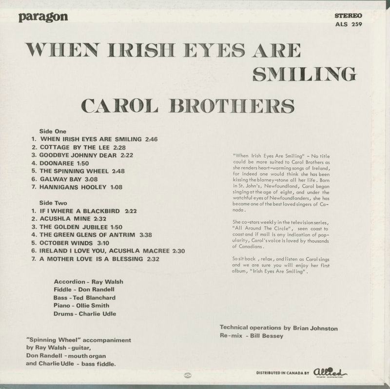 "When Irish Eyes Are Smiling" - No title could be more suited to Carol Brothers as she renders heart-warming songs of Ireland, for indeed one would think she has been kissing the blarney-stone all her life. Born in St. John's, Newfoundland, Carol began singing at the age of eight, and under the watchful eyes of Newfoundlanders, she has become one of the best loved singers of Canada.