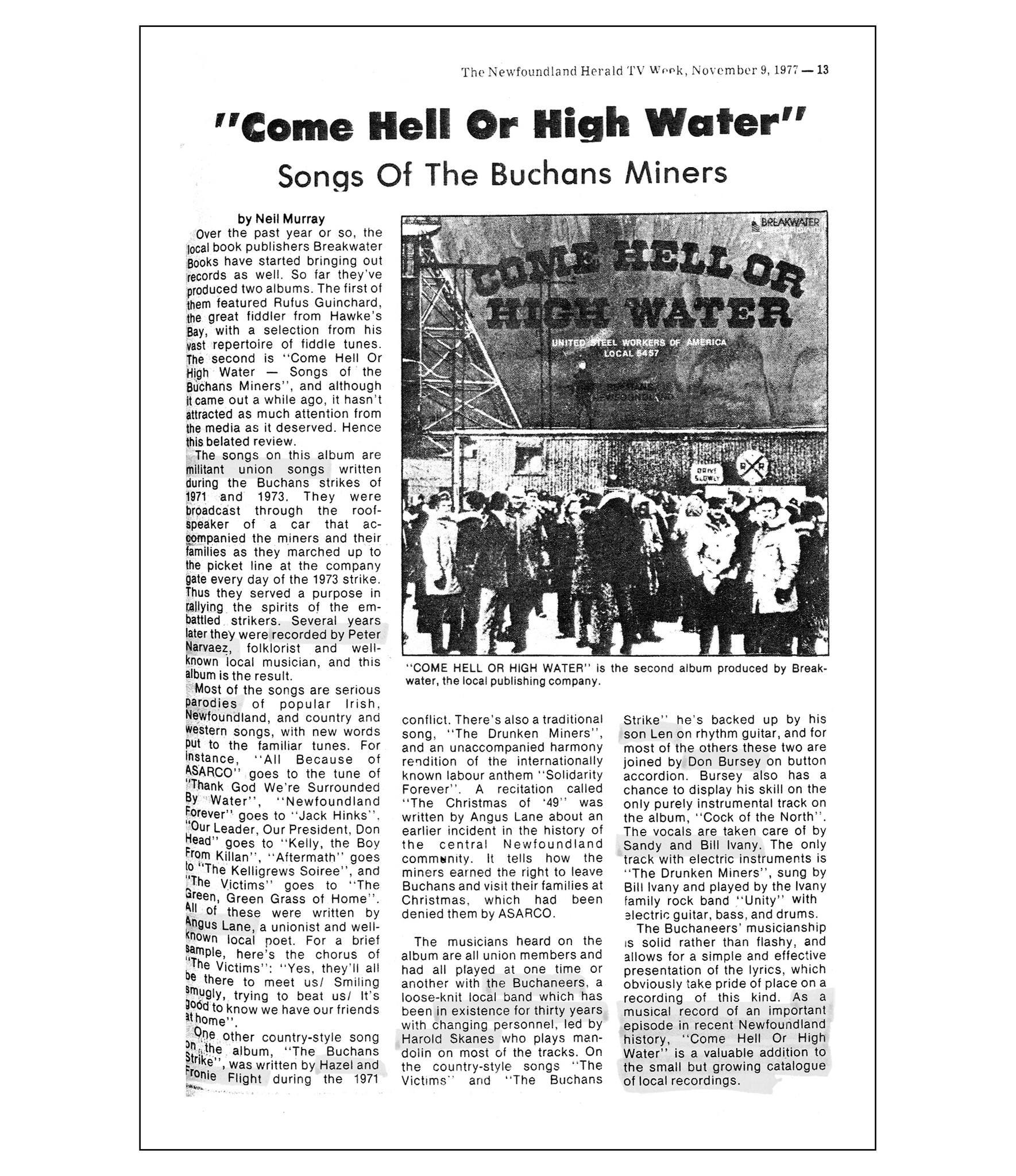 The Buchaneers’ musicianship is solid rather than flashy, and this album is a simple effective presentation of the lyrics, which obviously take pride of place on a recording of this kind. As a musical record of an important episode in recent Newfoundland history, "Come Hell Or High Water" is a valuable addition to the small but growing catalogue of local recordings.