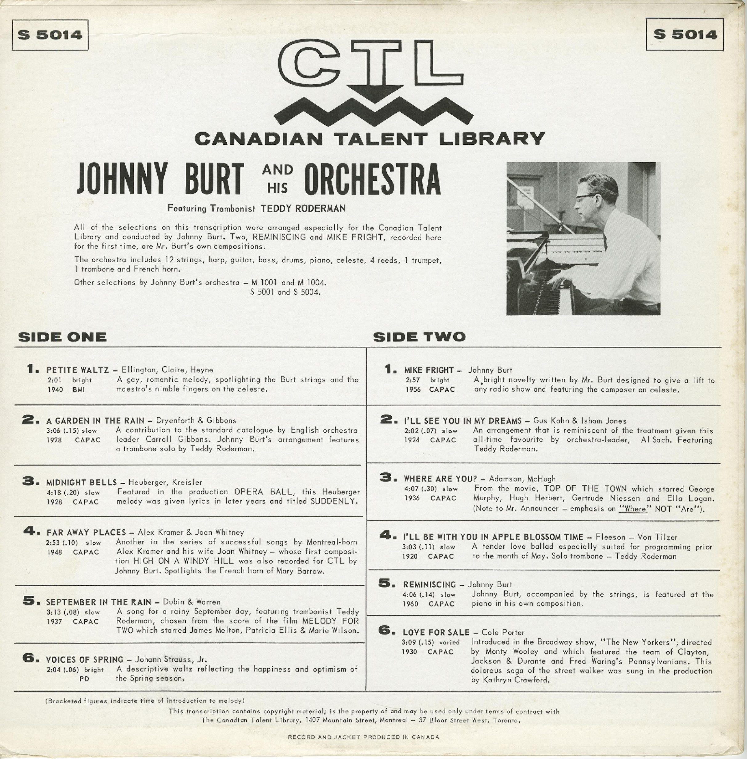 All of the selections on this transcription were arranged especially for the Canadian Talent Library and conducted by Johnny Burt. Two, REMINISCING and MIKE FRIGHT, recorded here for the first time, are Mr. Burt’s own compositions.