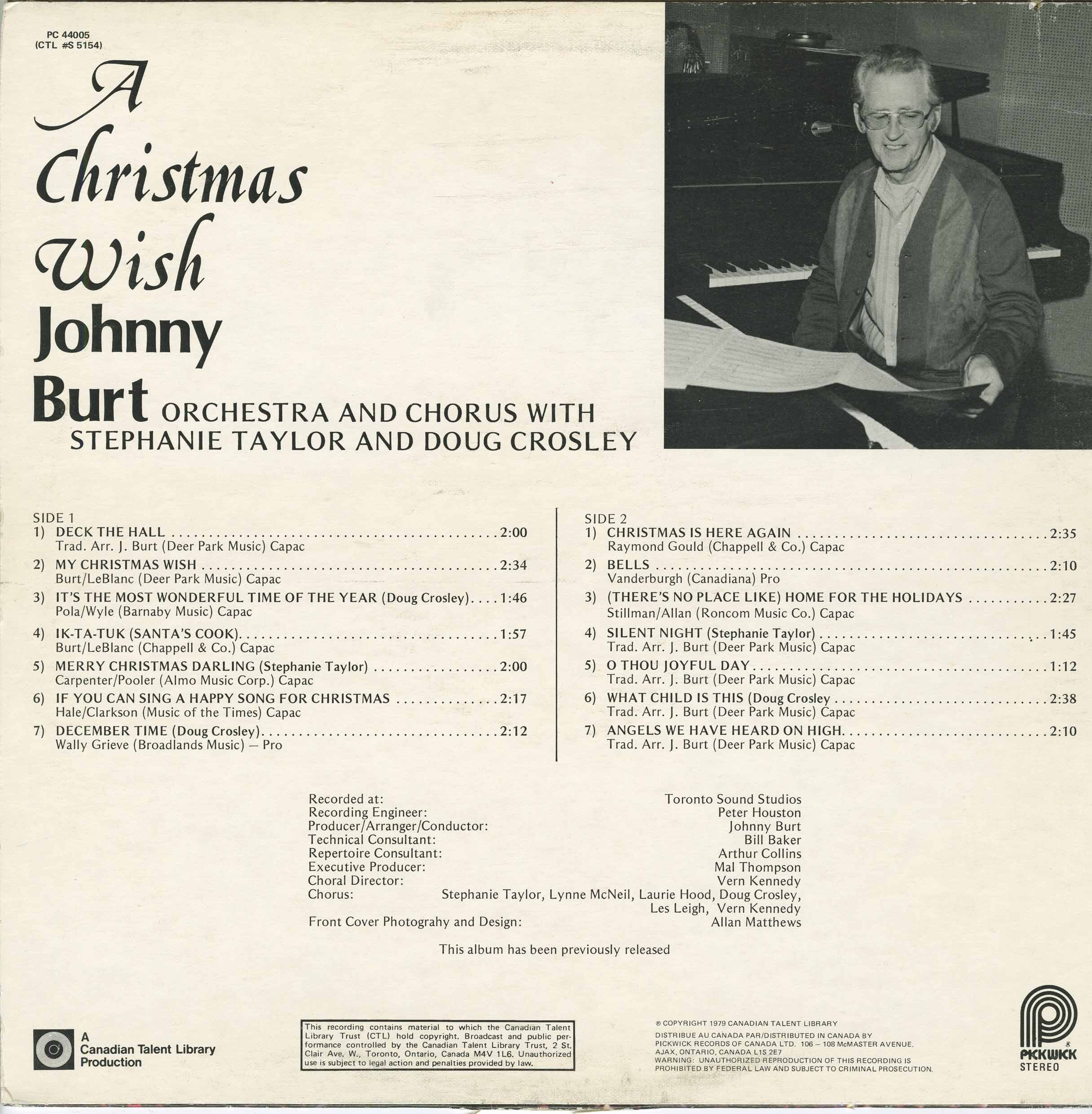 In 1972, Burt released one of his most distinctive albums under the name The Johnny Burt Society: …Come Summer (CTL 5160), a sunshine pop/jazz vocal LP featuring six singers (Stephanie Taylor, Lynne McNeil, Kathy Collier, Les Leigh, Harvey Paterson, and Vern Kennedy) and a studio orchestra that included Moe Koffman, Ed Bickert, Peter Appleyard, Guido Basso, and Eugene Amaro. The record offered sparkling renditions of contemporary hits like “Cherish,” “The Candy Man,” and “Speak Softly Love,” and remains one of the rarest and most sought-after releases in the CTL catalog.