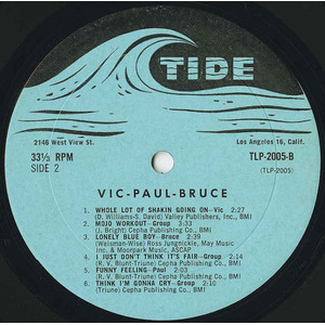 Here's a rare novelty one-off lp from the Canadian Beadles, who formed in Sarnia, Ontario in 1961. This album was released in 1964 on the tiny Los Angeles Tide label (Tide TLP-2005). The members of the band were Vic Miller, from Vancouver B.C., Paul Case from Kingston, Ontario and Bruce Pollard (aka Brucie Baby or Pretty Boy) who hails from Sarnia, Ontario. Bruce Pollard was formerly with the Staccatos and joined up with Vic and Paul of the Blue Echoes to form the Canadian Beadles. Later on, they would record a few 45's together as Vic, Paul & Bruce on the Quality and Tide labels. Most of the tracks are originals by the Canadian Beadles with a few remakes.
