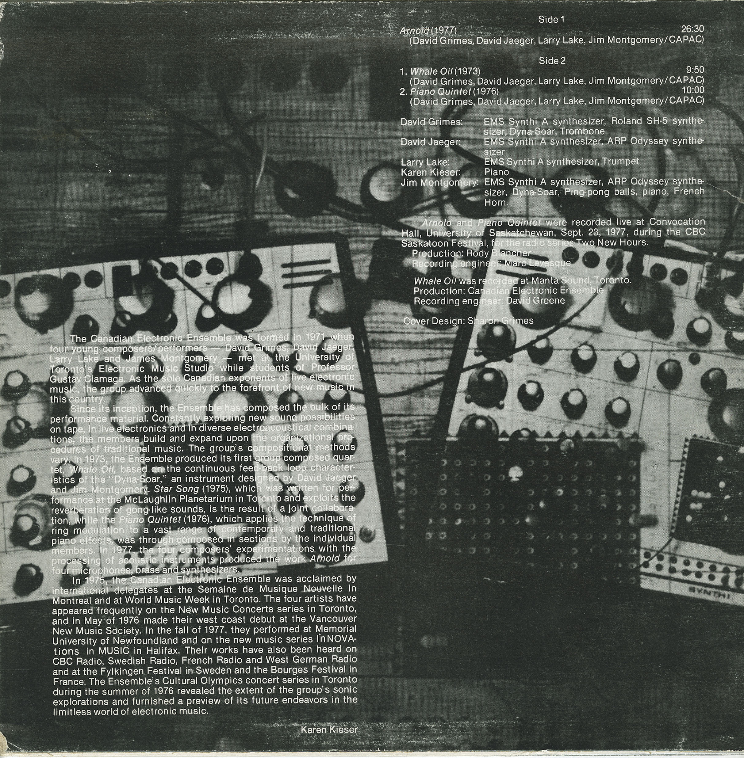 The Canadian Electronic Ensemble was formed in 1971 by four young composers/performers: David Grimes, David Jaeger, Larry Lake, and Jim Montgomery, at the University of Toronto’s Electronic Music Studio. Under the guidance of Professor Gustav Ciamaga, the group quickly advanced to the forefront of live electronic music in Canada.