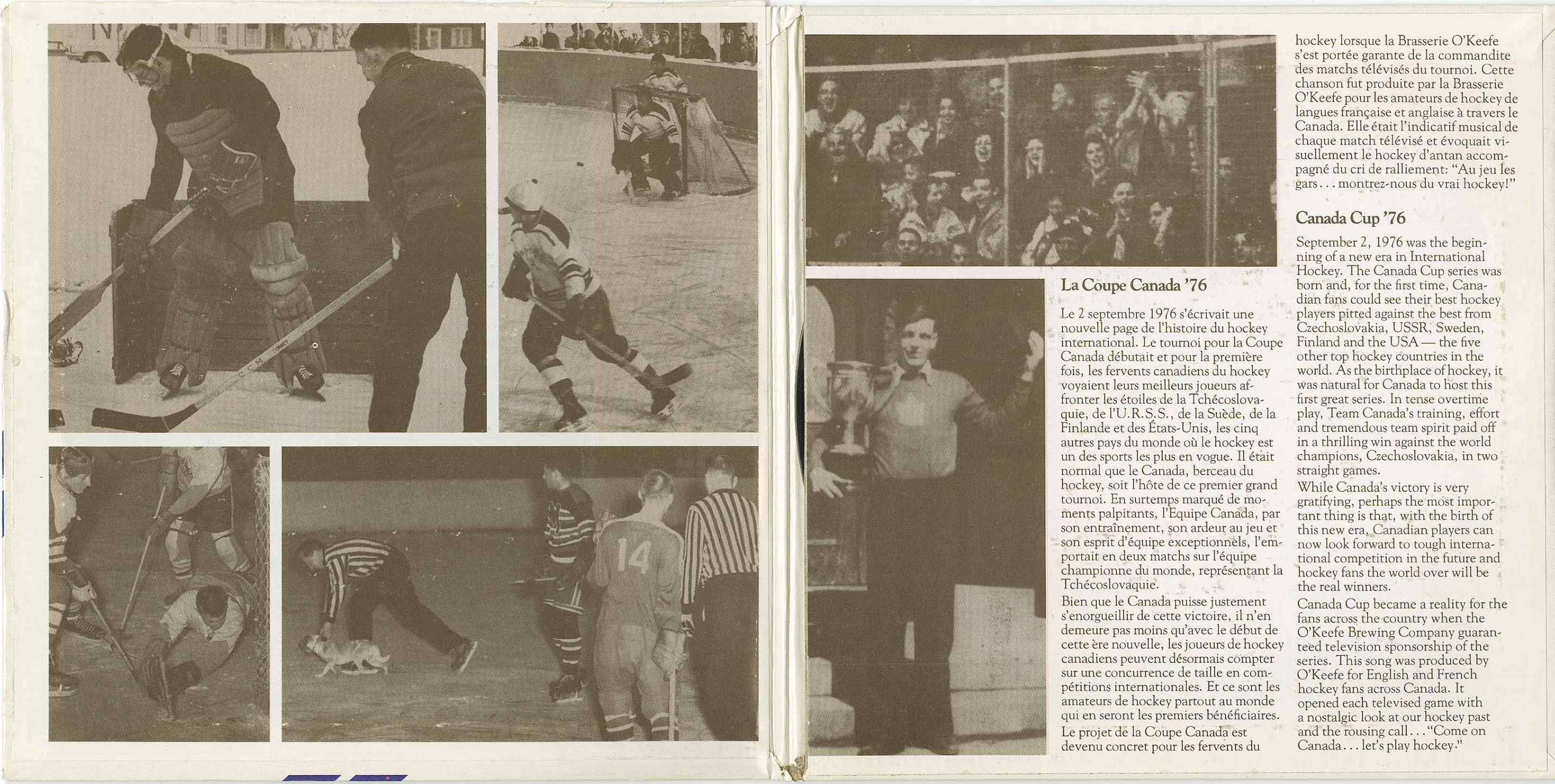 The cover of this record is a similar design to the front of the Canada Cup game program. The half maple leaf represents the Canada Cup itself, which was designed by the Brewery’s Art Director, Ralph Huencking.