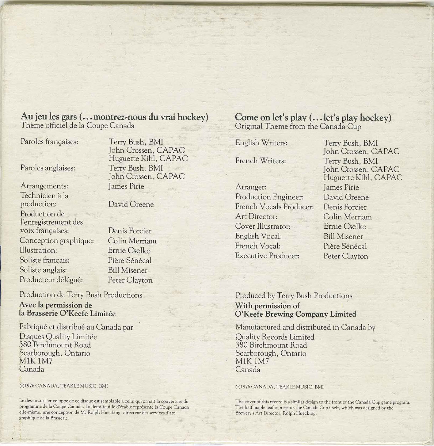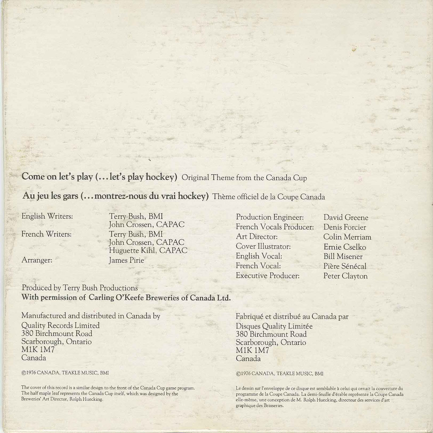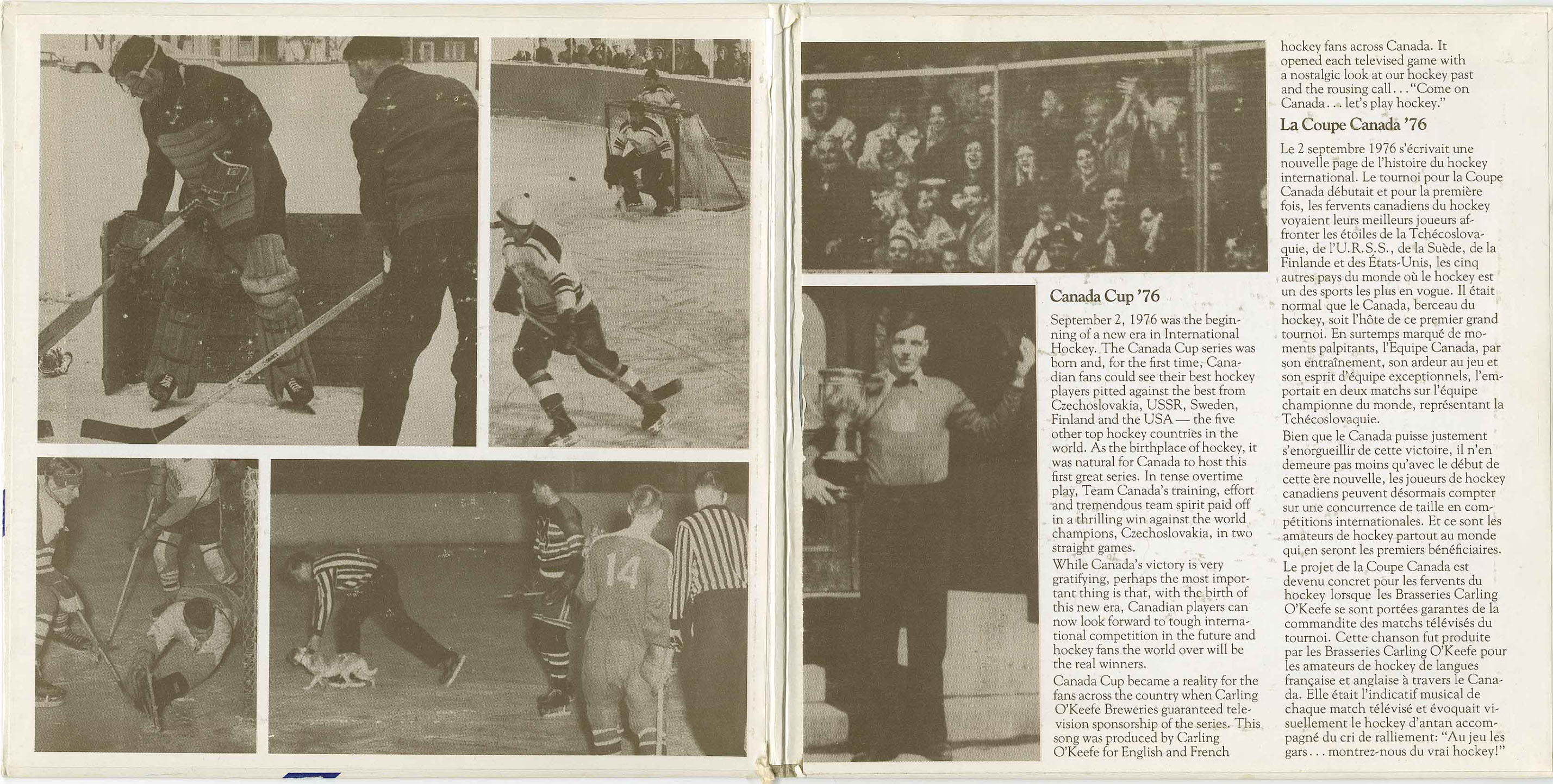 Canada Cup became a reality for the fans across the country when Carling O’Keefe Breweries provided television sponsorship of the series. This song was produced by Terry Bush for O’Keefe for English and French hockey fans across Canada. It opened each televised game with a nostalgic look at our hockey past and the rousing call: … “Come on Canada… let’s play hockey.”