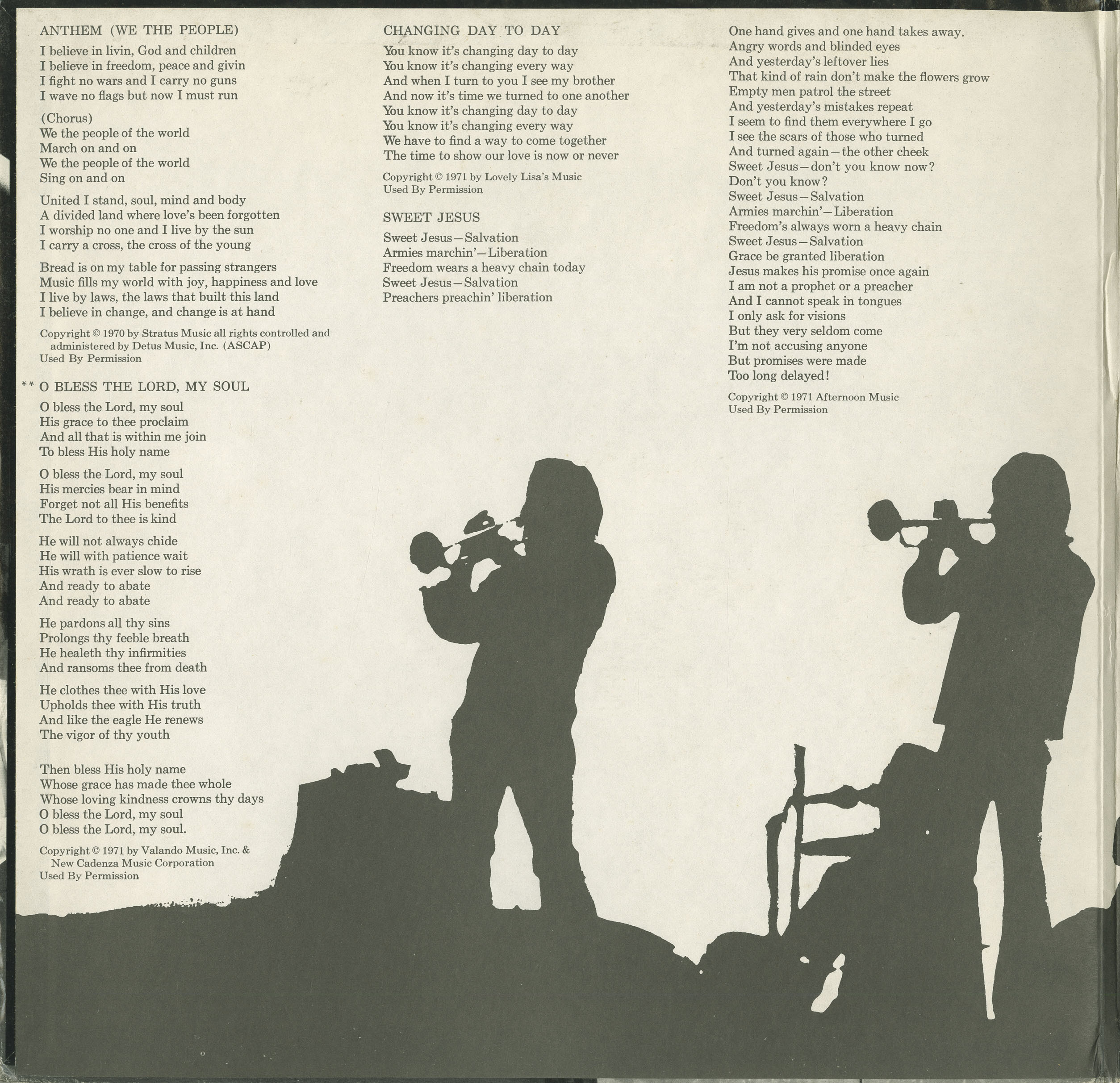Their self-titled album, released in 1972 on Lion Records, captured the spirit of the era with a mix of original songs and covers of contemporary rock musicals such as Jesus Christ Superstar and Godspell. The ensemble was produced by Peter Mann and Perry Botkin Jr., with arrangements by Steve Brundage and engineering by Ed Greene and Steve Smith, recorded at MGM Recording Studios in Hollywood, California.