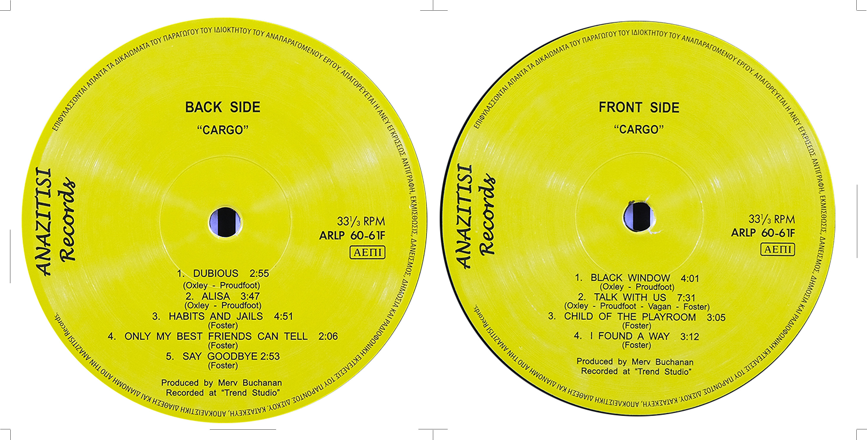 tracks and credits: Black Window (Oxley, Proudfoot. G. Creighton on bassoon. Guitar dialogue by B. Oxley)/ Talk With Us (Oxley, Proudfoot, Vagan, Foster)/ Child of the Playroom (Foster)"The most deadly of all possible sins is the crushing of a child's spirit". Flute by F. Nakashima (Friend). M Proudfoot on electric piano // Dubious (Oxley, Proudfoot) Electric piano on M. Proudfoot. "We;ve been laughing but nobody's been playing"/ Alisa (Oxley, Proudfoot). Friend Frank Nakashima on flute. M. Proudfoot on baritone sax. N. Foster on bongos. G. Vagan on clave riff/ Habits and Jails (Foster). Electric piano attacked by M. Proudfoot/ Only My Best Friends Can Tell (Foster). Guitar-N. Foster/ Say Goodbye (Foster). Hands and voices by people we like. (People-Greg, Les, Ronnie, Cathy, Carol, Kathryn, Gabe).