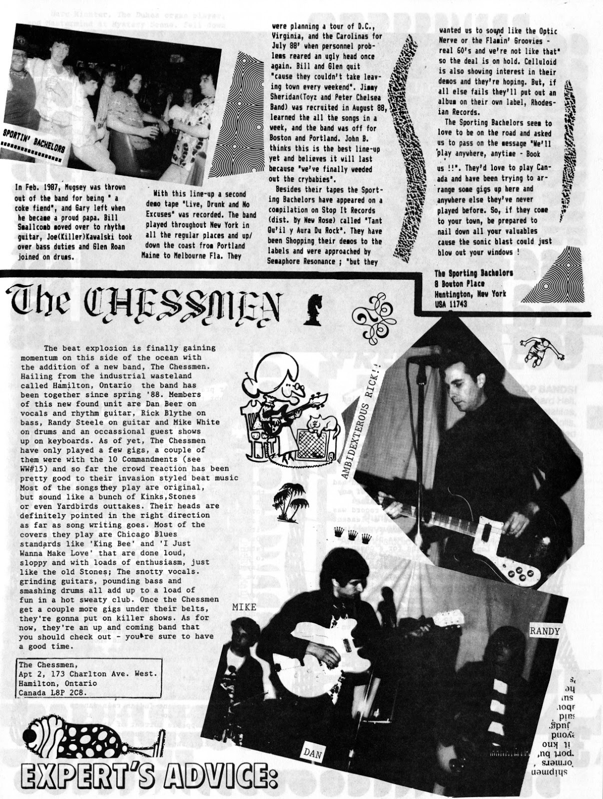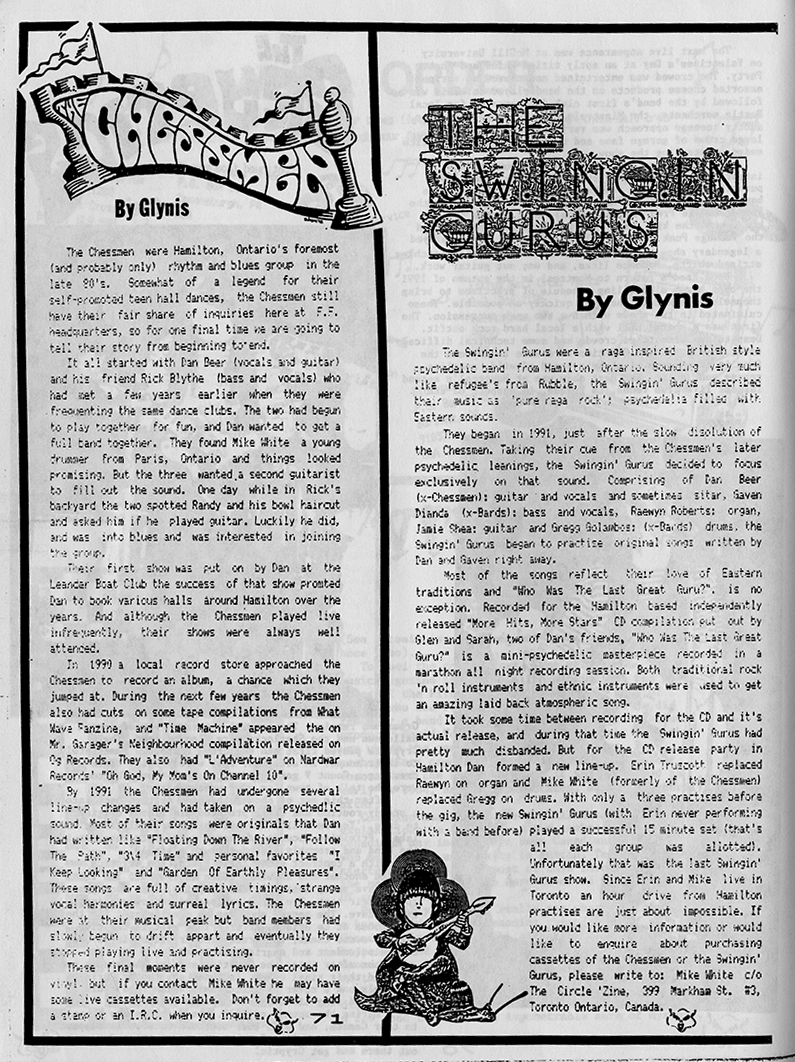 The Chessmen launched one self titled album on ZAP records in 1989. The sound was more thin than their live acts and shortly thereafter they went psychedelic with longer songs like Follow the Path, Floating Down the River and Garden of Earthly Pleasures. They disbanded still friends and did a few reunion shows like the Baron of Time show at Amigos in Hess Village. Time Machine and several other songs were featured on garage compilations from around the world: Time Machine Mr. Garager’s Neighbourhood