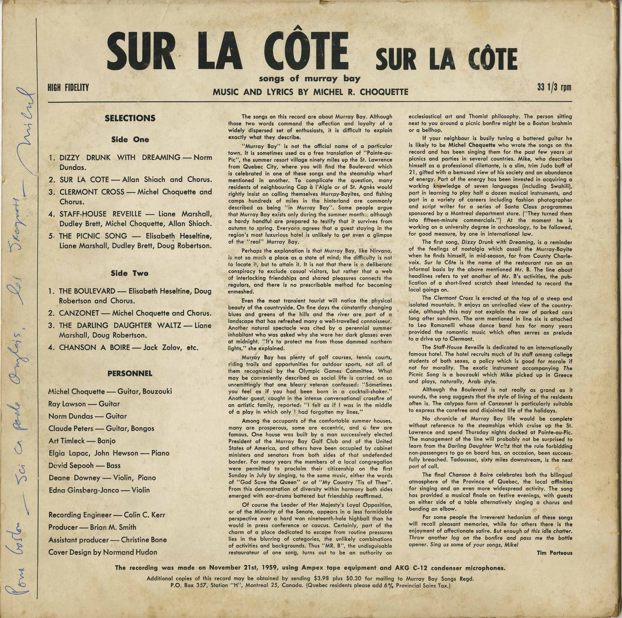 Here is an amazing album, a privately pressed recording of folk songs written about Pointe-au-pic, formerly referred to as Murray Bay, Quebec with the remarkable cover art by famous Quebec artist Norman Hudon. Michel R. Choquette, French-Canadian spontaneous humorist/satirist and folk singer was born in 1938 and toured around Canada at coffee houses and the like reciting beat poetry and playing his own unique compositions. A Canadian icon for sure. Read the extensive back cover notes for more info.