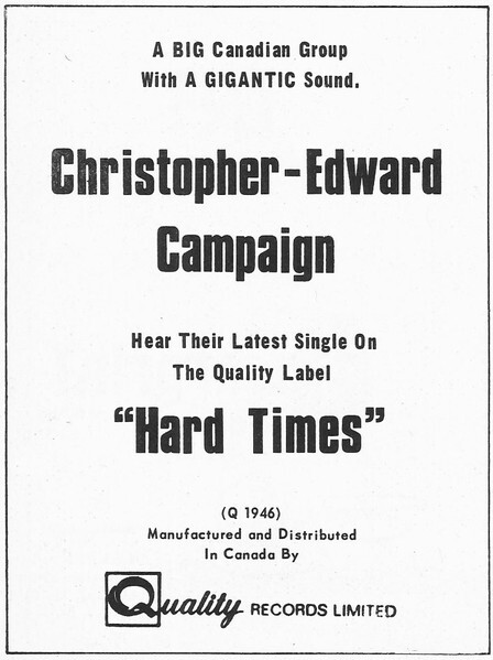 By mid-1969, the Christopher Edward Campaign were making regular appearances in RPM Weekly, with reports of gigs at Toronto venues like The Night Owl, The Concord Tavern, and an Ontario university circuit. Studio time at Quality Records was also noted, and the band seemed poised for a breakout.