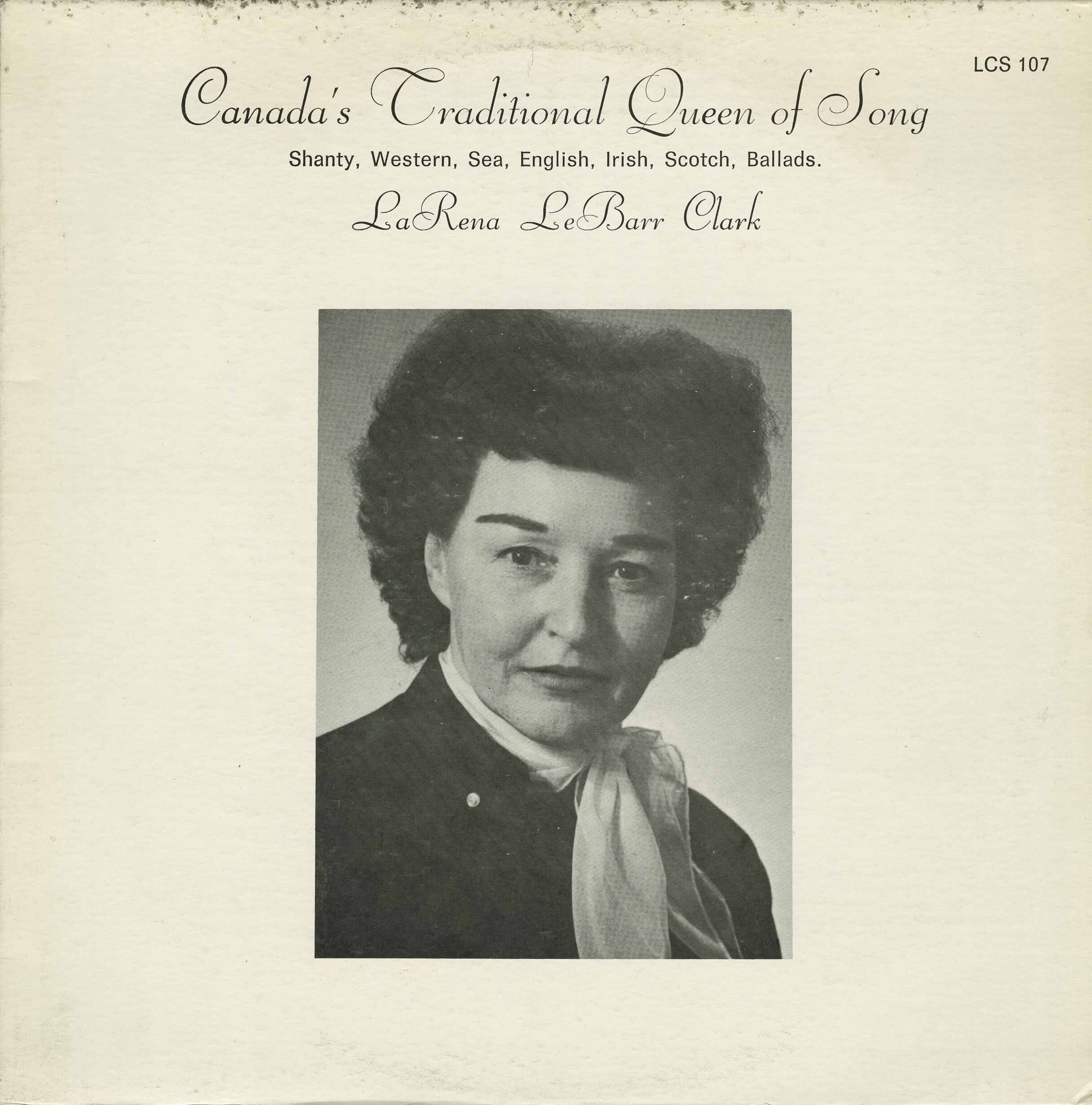 Mrs. Gordon Clark, who was born LaRena LeBarr, is an Ontario singer who learned a great traditional song from both her parents and grandparents in her youth. This record emphasizes the older British songs and recitations, but she also knows lumbering songs, local ballads, and semi-improvised comical songs concerned with animals and neighbours. Her father and she have been in contact with the LaRena's since French colonists who came to Canada early in the nineteenth century. The Clarks, originally from the Ottawa Valley, moved to Huntsville in Muskoka, Ontario, near Lake Simcoe, and obtained a land grant near Lake Simcoe. In those wooded hills, great log jams stood in boom towns; when these broke, as on the great log jam on Deep Bay (Cannington), they sent logs into a vast pond landing in the rich Lake Simcoe clay. This pond is now used by the Ontario Fish Hatchery.