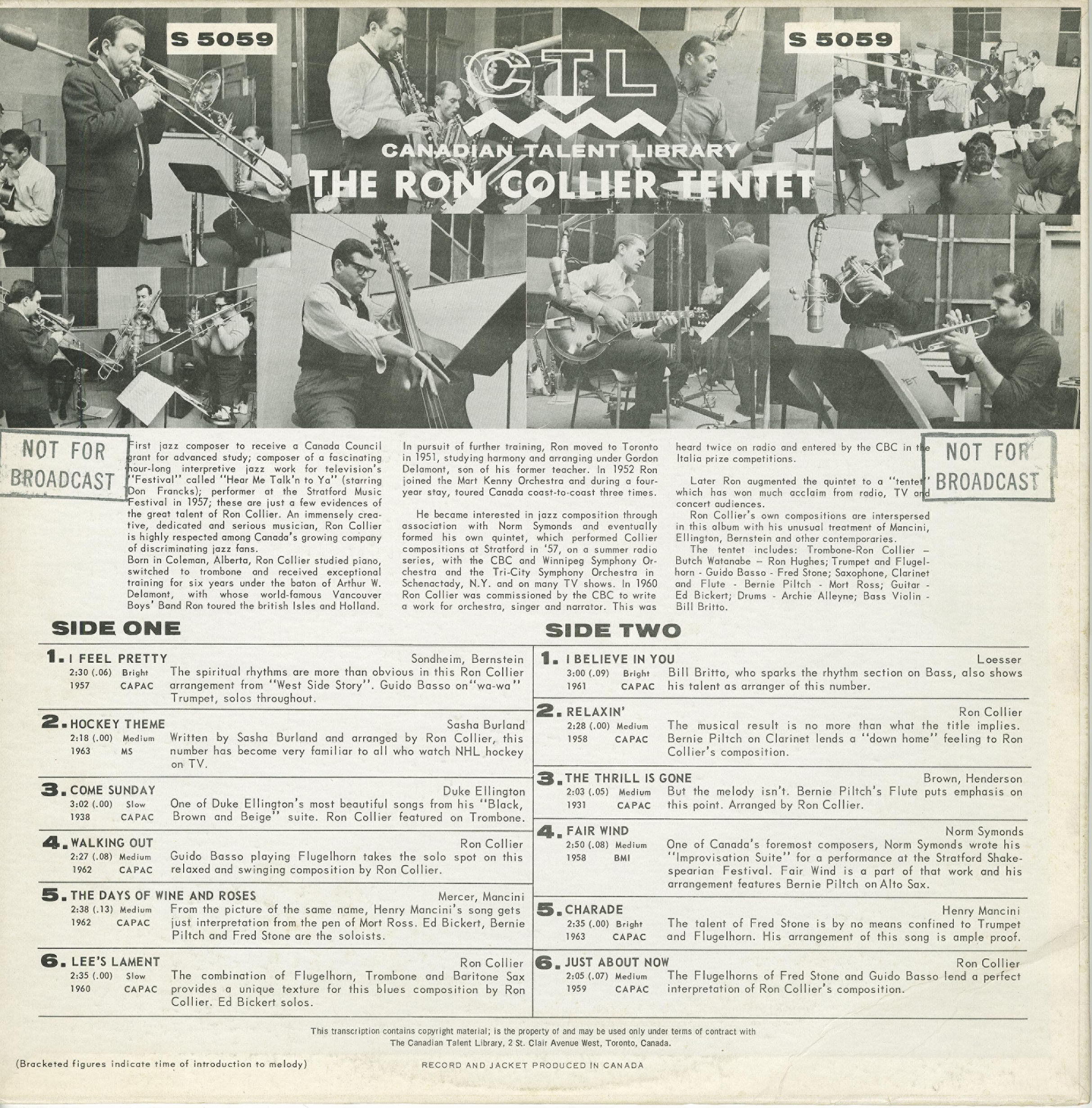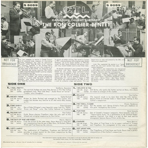 The first jazz composer to receive a Canada Council Grant for advanced study, Ron Collier is one of the young-and-unpretentious new look of television jazz. Ron appeared last year for a Marking Time Special (Toronto’s tribute to the Stratford Music Festival, 1957). These same talents were evident at the Stratford performance of his own music, and this excellent Tentet record. As a musician-composer and arranger (and sometimes actor), Ron Collier has performed for the CBC, CTV, and in film.
