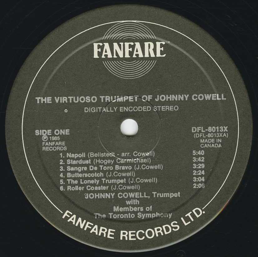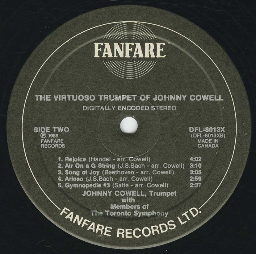 In some ways, The Virtuoso Trumpet of Johnny Cowell is a “cross-over” album, one of those curiously defined records that literally cross the boundaries between pop and classical music. Johnny Cowell was one of the first in the current generation of musicians to meet composers like Bach, Handel, Beethoven, and Satie head on, and to bring his own musical sensibilities and style to their work. Side Two of this album demonstrates how successfully a bridge can be built between the 18th and 19th centuries and the 20th century.