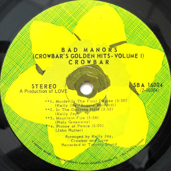 The most popular of Crowbar's singles were 'Oh What a Feeling' (1971) and 'Million Dollar Weekend' (1974). The band made three LPs 1970-2 for Daffodil - Bad Manors (SBA-16004), Larger than Life (And Liver than You'll Ever Be) (2-SBA-16007, recorded in concert at Massey Hall) and Heavy Duty (SBA-16013) - and one in 1973 for Epic, KE32746 (KE-32746). The compilation Crowbar Classics: Memories Are Made of This (SBA-16030) followed.