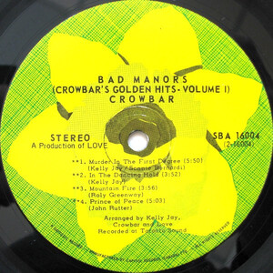 Musical differences severed ties between Newell and the band the next year however, and Crowbar set sail to England to prepare for the next album. Recorded in Mike Oldfield's English castle, BAD MANORS was released in the spring of '71. The first single epitomized the care-free hippie generation of the day, and "Oh What A Feeling" soared up the charts. This was the first single released after government regulations requiring Canadian radio stations to play one-third homegrown material had come into effect. The single quickly reached gold here, but due to the drug annotations in the song, it didn't receive airplay in the US. Other noteable songs included the 'b' side "Murder In The First Degree", the cover of The Yardbirds' "Train Kept a Rollin'" and the other singles "Happy People" and "Too True Mama".