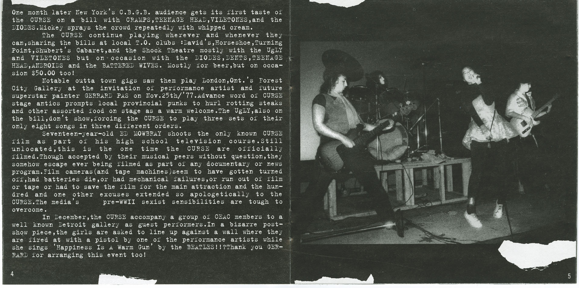 The Curse continued playing around Toronto — David’s, the Horseshoe, Turning Point, Shubert’s Cabaret, the Colonial Underground — sharing bills with acts like the Battered Wives, Androids, Dents, Teenage Head, and Diodes. Their antics drew as much backlash as admiration. During a performance at London, Ontario’s Forest City Gallery (Nov. 25, 1977), hostile local punks welcomed them with hurled steaks and rotting food. Still, they played three full sets of their eight songs, in three different orders.