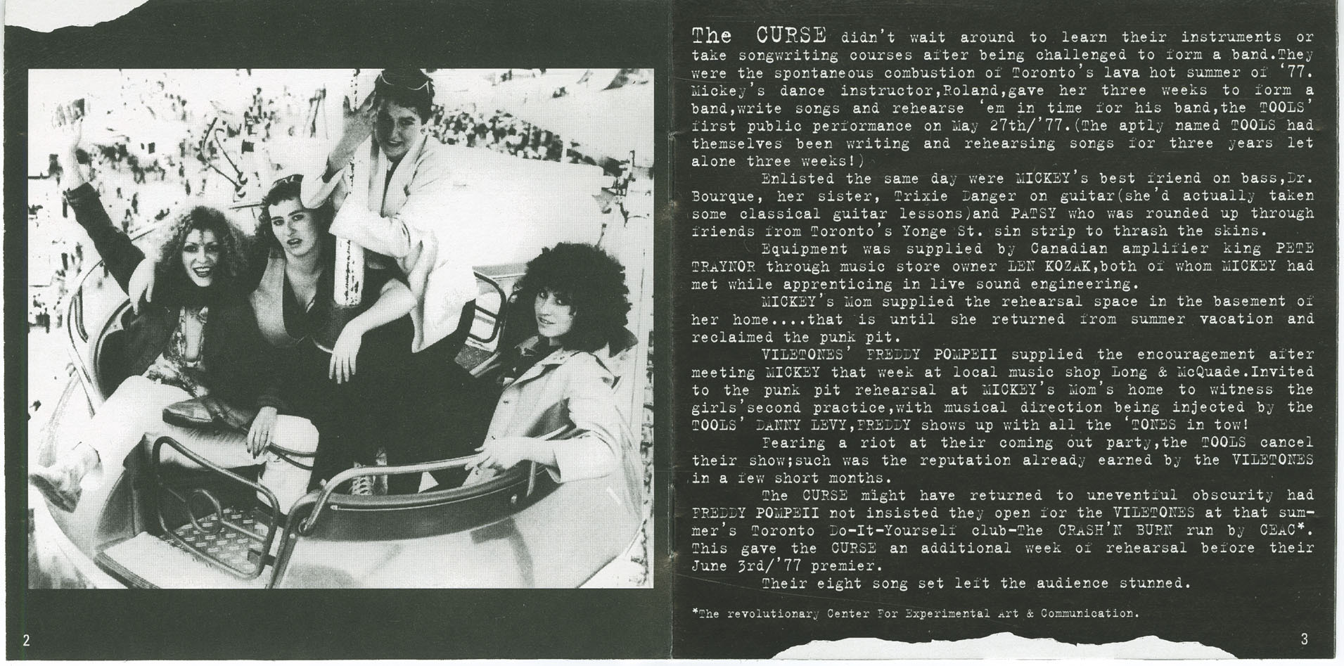 Formed in May 1977 by dancer-turned-frontwoman Mickey Skin, The Curse emerged from a dare. Her dance instructor, Roland Kirouac (of The Tools), gave her three weeks to put a band together and open for his group. With no time to spare, Mickey recruited her close friend Dr. Bourque on bass, her sister Trixie Danger on guitar (who’d taken some classical lessons), and drummer Patsy Poison, a friend from Yonge Street’s nightlife. They had never played in bands before. Within three weeks, The Curse had written eight songs, assembled a full set, and made their debut.