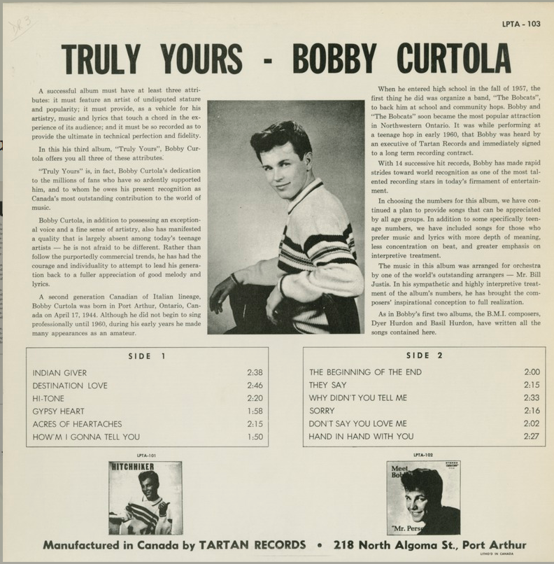Bobby Curtola was born in Port Arthur, Ontario (now Thunder Bay) on April 17, 1943, and grew up like many kids of his generation—dreaming of the excitement he heard pouring out of the radio. By his mid-teens he was singing at sock hops with his band, the Bobcats, and pumping gas at his father’s garage to help pay for the adventure. What set him apart was a voice both smooth and powerful, and the movie-star looks that instantly won over teenage crowds.