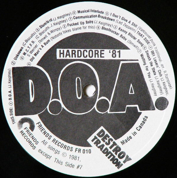 this record never had any insert or poster distributed with it. This misconception comes from the fact that, during the same period, Friends Records sold some extra promo poster for the first three D.O.A. releases (most posters were distributed to the record stores who carried the LP's and they sold the extra ones through mail order) and the poster read "Hardcore 81" with the pictures of the first three D.O.A. 12" on Friends Records. This poster was NEVER distributed with the Hardcore 81 LP. It was given away to record stores OR sold separately. This album was released on the legendary Vancouver Label Friends Records, which was VERY D.I.Y. cause they re-used surplus record jackets they obtained from other record labels. They printed over the original jackets with black ink, turned them inside out and pasted their covers on the other side. It was so neatly done, most people didn’t knew that!