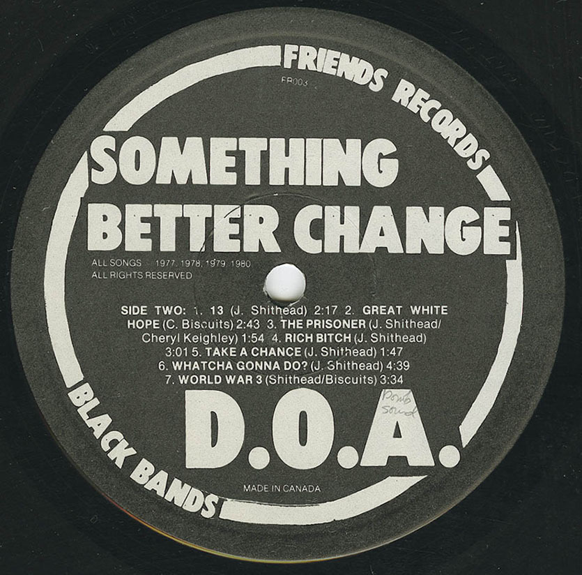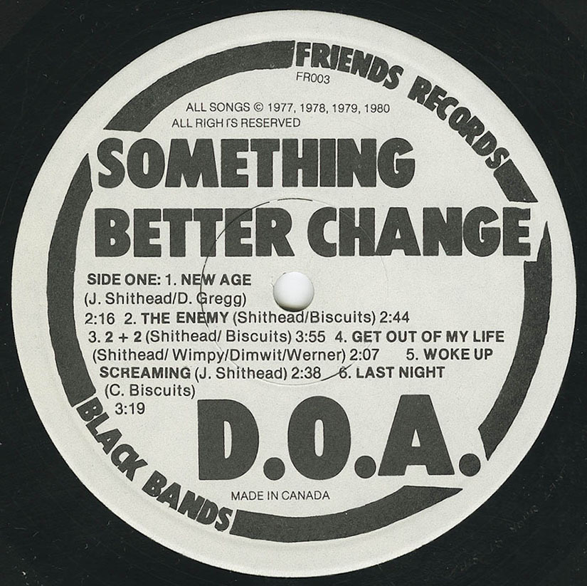 About time! For nearly two decades since they went out of print, the first two classic punk DOA LPs were bowdlerized into Bloodied But Unbowed, and then, to address the numerous songs regrettably removed in the process, the Polish import (!) non-LP Greatest Shits appeared. Yet, when one considers how revolutionary and yet how distinct from each other those two LPs were, this state of affairs just made no sense. In an era when so few North American punk greats ever made an actual LP, how could two such crucial ones remain so unavailable for so long? Thankfully, here's the first of them, in its natural, restored state, just as it appeared in 1980 -- and how glorious it remains! The product of two years of solid gigging in their native Vancouver, by the hottest punk rock band the West Coast ever produced this side of the much different Weirdos and Avengers, Something Better Change features a trio so molten, they didn't even manage to get it all down in the studio. And yet it still is an absolutely awesome record. So heavy with chops it nearly leaks, soaring like the best Clash/Pistols/S.L.F. riffs filtered through an American anvil power even those greats couldn't approach. On the faster cuts, DOA just turn the aggression up several notches. And on the slower cuts they prove themselves as much a strong, fiery, spit-a-flyin' rock & roll band as they are a punk one. Sadly, there is only one bonus track, the also great re-recording of their first EP "Disco Sucks" as "New Wave Sucks." But for those who thought that the English had the market cornered on late-'70s punk, DOA could flat-out outplay them all, and this LP is a bomb with sociopolitical smarts and irreverent attitude.