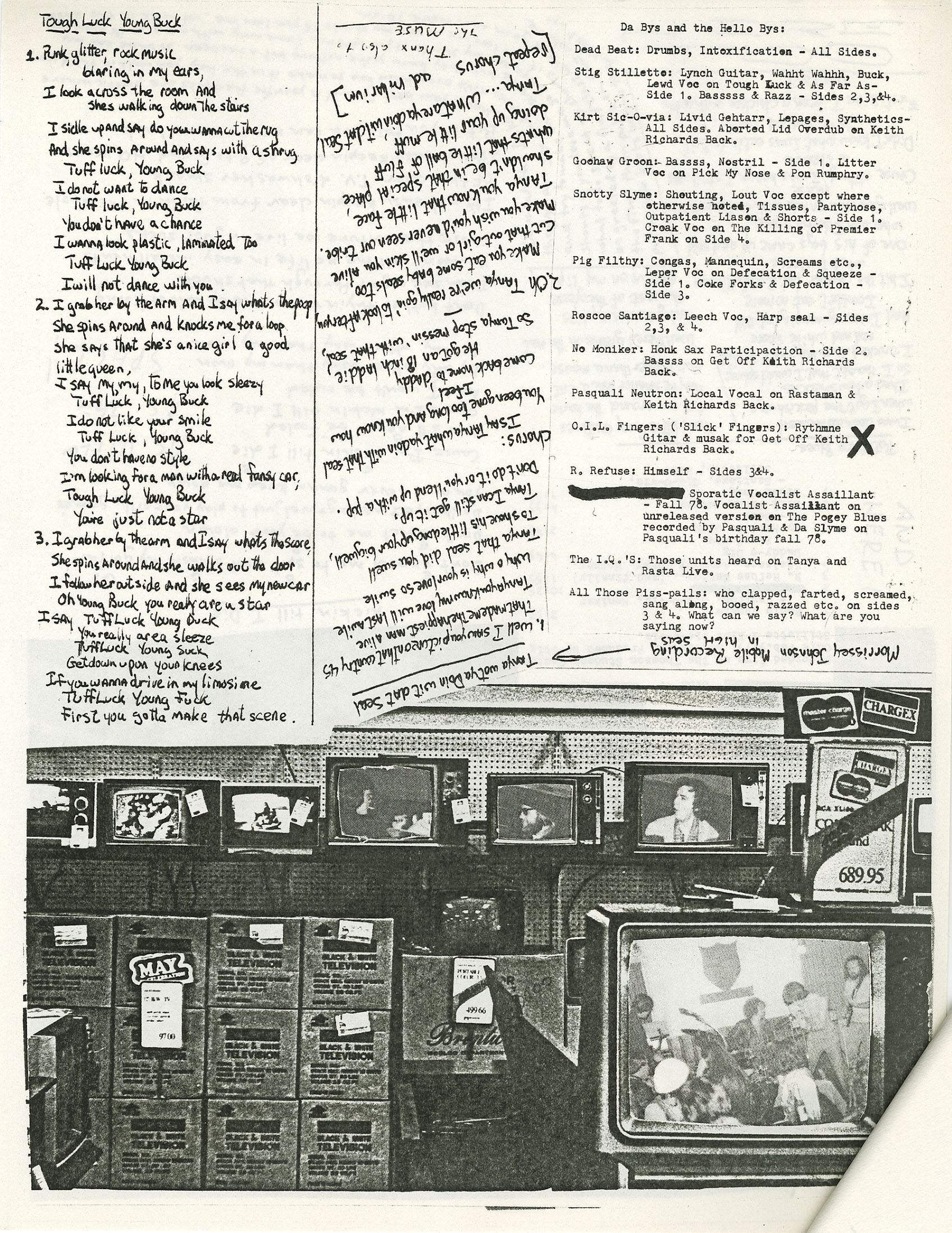 The album was released in 1980 and was comprised of 2 lp’s (first punk 2lp released in Canada); one studio, one live, as well as extensive DIY style liner notes. After cutting the lp’s, Da Slyme ran out of cash so they went down to the local Salvation Army, bought some cheap albums for 25 cents each, spray painted the covers and housed the albums in a brown paper bag cover. Some of the albums that they spray-painted were Mr Dressup, Pink Floyd, Chris DeBurgh, Carlton Showband, Donna Fargo, The Bell Jubilee Sound, and Kris Kristofferson. (MoCM owns the Pink Floyd, Mr. Dressup and Kris Kristofferson copies). This particular copy shown is somewhat unique, likely one of only a couple signed by all the band members: The music itself is raw punk, ska, reggae, etc.