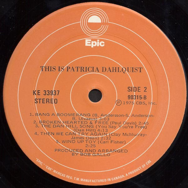 She released a single in 1975 called Keep Our Love Alive (Columbia C4-4095) which spent seven weeks in the Canadian top 40. It entered July 5, 1975 and peaked at number 20 on September 27. She also released the album "This is Patricia Dahlquist" that same year.