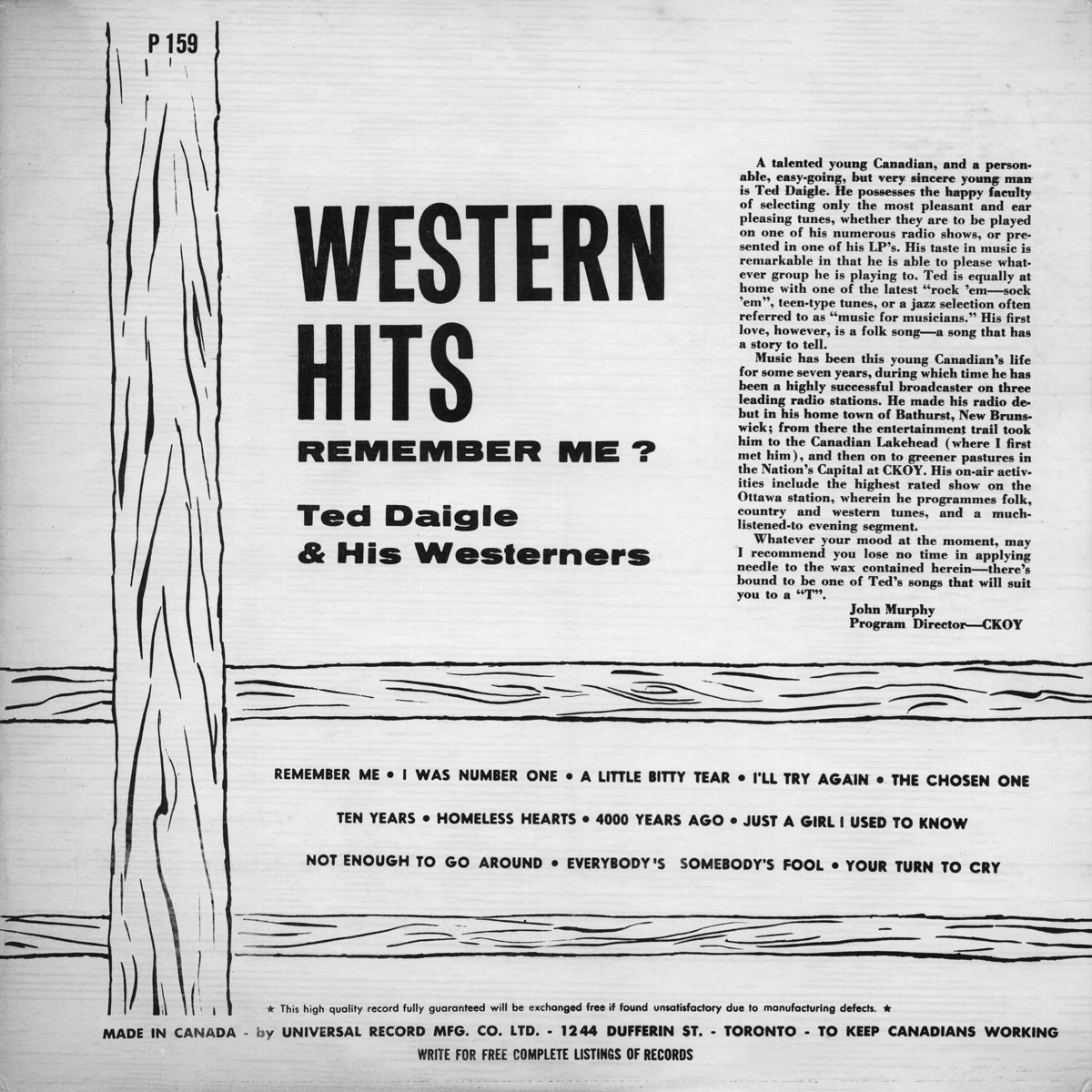 A talented young Canadian, and a personable, easy-going, but very sincere young man is Ted Daigle. He possesses the happy faculty of selecting only the most pleasant and ear-pleasing tunes, whether they are to be played on one of his numerous radio shows or presented in one of his LPs. His taste in music is remarkable in that he is able to please whatever group he is playing to. Ted is equally at home with one of the latest "rock ’em—sock ’em" teen-type tunes or a jazz selection often referred to as "music for musicians." His first love, however, is a folk song—a song that has a story to tell.