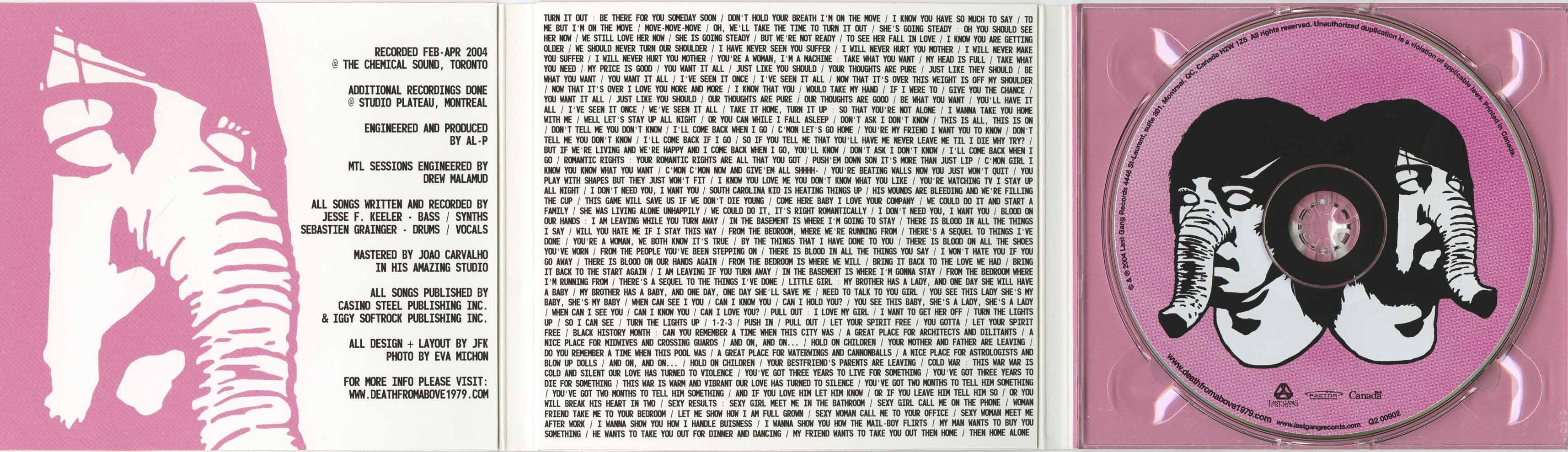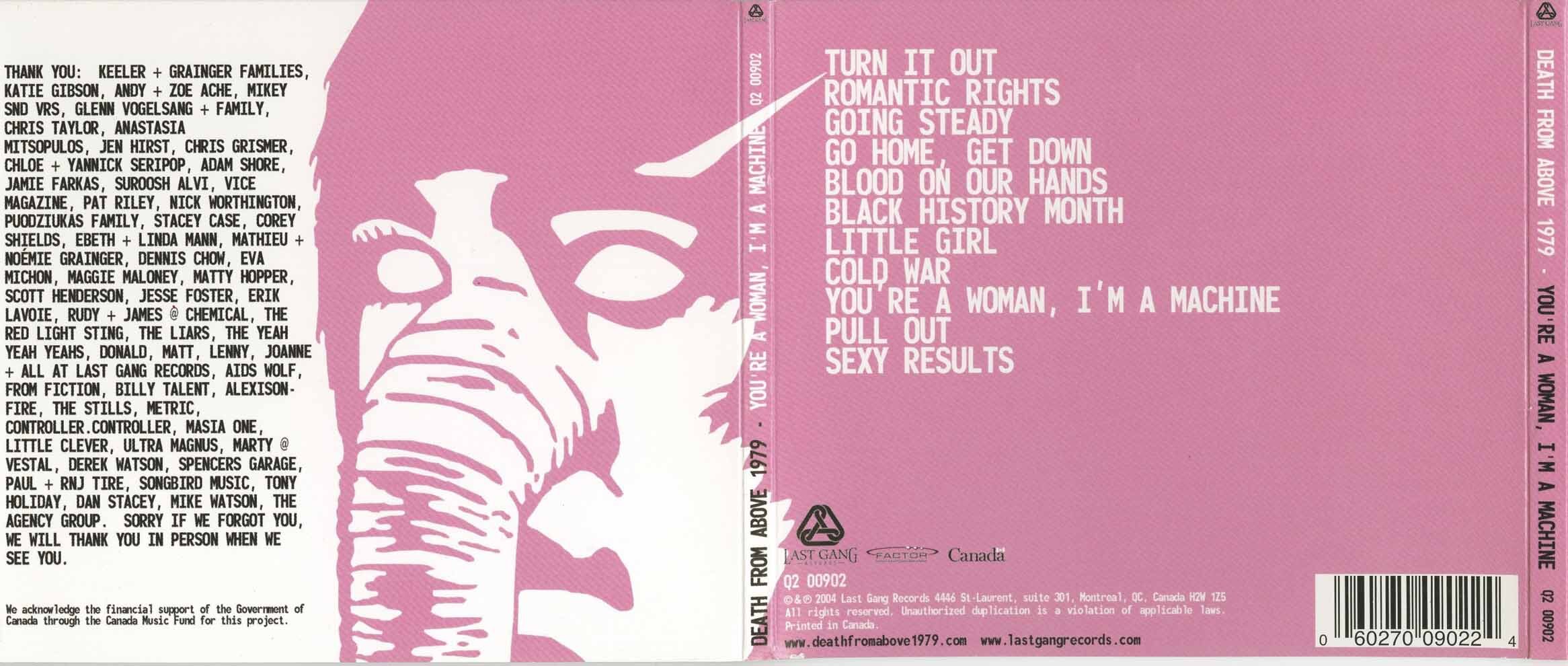 Still, emo these boys certainly ain't, as the bottom line with You're a Woman, I'm a Machine is that it rocks very, very hard, best exemplified by such tracks as "Turn it Out", "Blood on Our Hands", and "Little Girl". The album comes to a terrific climax with a sexually charged trifecta of tunes; after the propulsive "You're a Woman, I'm a Machine", the frantic "Pull Out" has Grainger singing, "I love my girl/ I want to get her off," but the song winds up sounding as hilariously rushed as a nervous teen, right down to the song's abrupt conclusion. "Sexy Results" gets downright funky, as Grainger sneers come-on lines over a pulsating, midtempo beat, Keeler echoing the vocals with a simpler than usual accompaniment, allowing Grainger's drums and vocals to dominate.