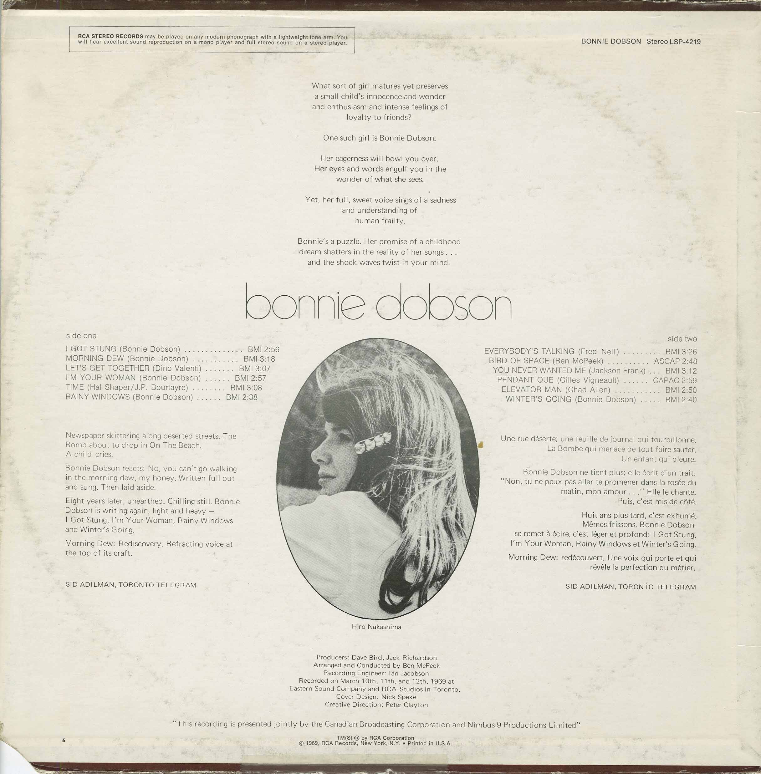 Bonnie Dobson Had already acquired legendary; status by the time she recorded this, her eponymous album in 1969. In the ten years since she wrote it, her song "Morning Dew" had long taken on a life of its own and flown far beyond the cafes of Greenwich Village, where the era's emergent troubadours turned out to see her play. Joan Baez may have taken inspiration from Bob Dylan; but Dylan dug Dobson the flame-haired Canuck who had toured with Sonny Terry & Brownie McGee. He even turned out to see her at Gerde's Folk City, using her arrangement of "The Ballad Of Peter Amberly" for his own "Ballad Of Donald White". Fred Neil unleashed his wild fret board mercury on "Morning Dew", in the process creating an arrangement that Tim Rose took and turned into his signature song.