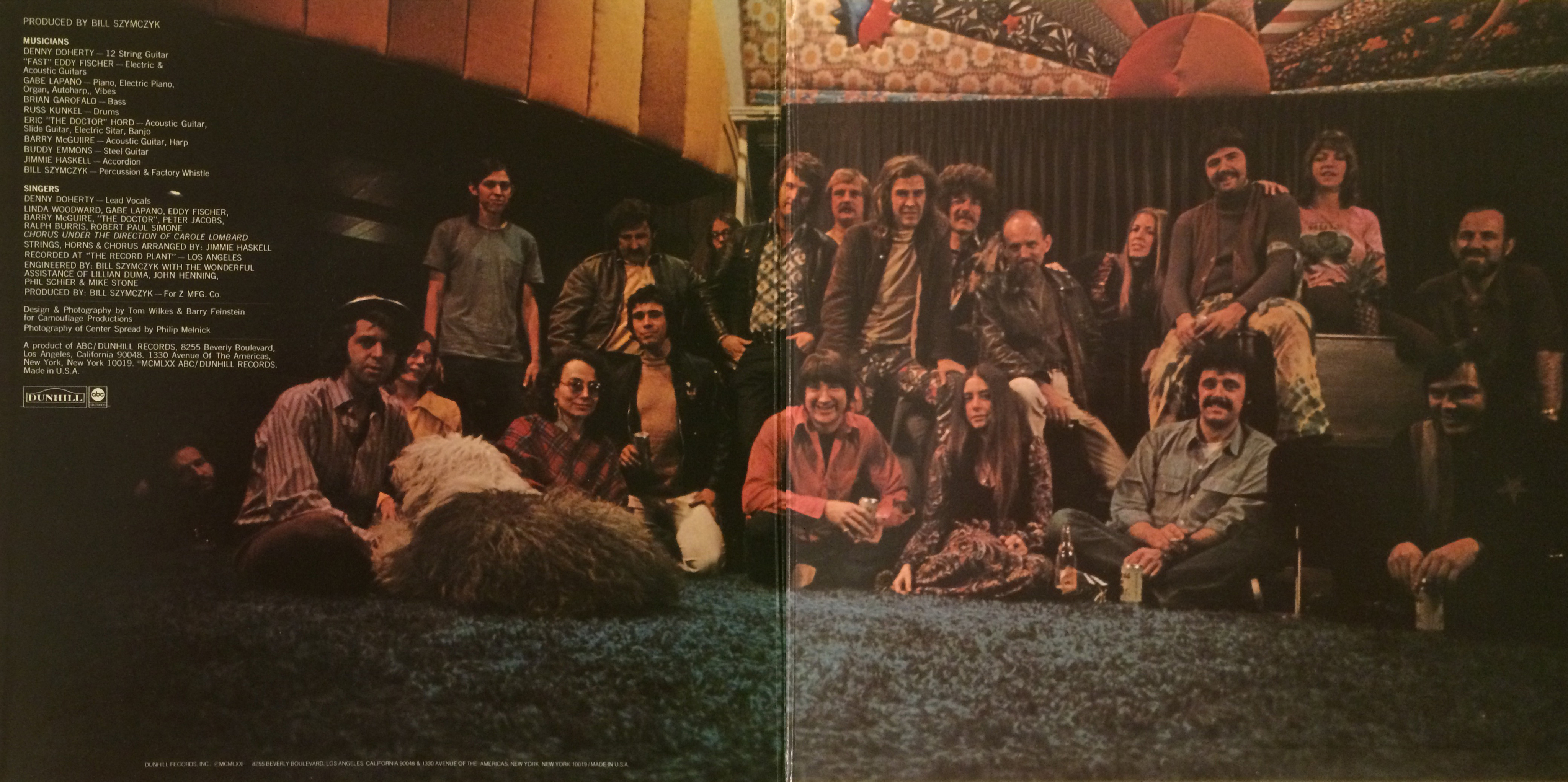 Paired with ABC/Dunhill’s staff producer Bill Szymczyk they gathered an ad-hoc group of Los Angeles’ finest studio musicians including staff writer Eddy Fischer along with Eric Hord on guitars, Gabe Lapano on piano, Bryan Garofolo on bass, Russ Kunkel on drums, and the “Big E” himself: Buddy Emmons on pedal steel. Denny’s label mate Barry McGuire sat in acoustic guitar and harp while Jimmie Haskell added accordion and string arrangements. The band was then complimented by an eight-person vocal chorus giving the group a full and rich sound on the album. Szymczyk later said of the sessions “It was almost like a Grateful Dead thing: ‘Come on, let’s all play and make a record.’”