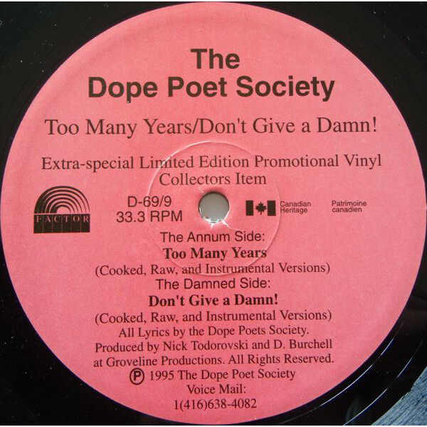 The Dope Poets society are a Toronto based hip-hop group whose focus is aimed more to political & humanitarian issues than the usual jigginess found in most rap music. Rather than singing about rolling down Jarvis in their benzos while the women chase them up the street, the dope poets have decided to do something uncommon in hiphop - tell the truth. Rather than brag about money and wealth, this track shows the honesty and passion that the dope poets have put in their music. Fuck Mike Harris is not a trick title, it's a song all about the evils of Ontario's Fuhrer, Mike Harris. This song kicks all ass. If things were fair, MuchMusic would be dedicated to playing tracks like this 24hrs a day. This song opens up with some samples of single mothers and welfare recipients. Throughout the song the poets rhyme very specifically about the lies perpetrated by the Canadian KKKonservatives. It's nice because it's not just whining about the Harris regime. These guys drop precise examples about what Harris has done during the past 5 years. All of this on top of a phat beat. Throughout the whole song they slide all kinds of rvvvolutionary samples into the mix. All in all, this is a bomm song. This is the way political rap should sound. Intelligent with a phatt beat.
