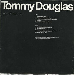 Tommy Douglas, 'The Greatest Canadian' released this album of his speeches and orations in 1971. The album was released in two versons, the standard jacket version and the boxed-set version. The boxed version came complete with a pictorial biography, a biographical essay, an 8x10 glossy photograph of Tommy Douglas and M.J. Coldwell, and a long playing record. The lp record has introductions and commentaries by Pierre Berton, and features selections from Tommy Douglas's greatest speeches and from his best-loved anecdotes and recitations, including the peroration of his 1945 speech against the attempted disallowance of Saskatchewan Legislation, portions of his adresses to the Canadian Labour Congress Conventions of 1968 and 1970, and his recitation of Burns's "A Man's a Man for A That", featured here. The record was edited by Laurier LaPierre and H.S. Lee.