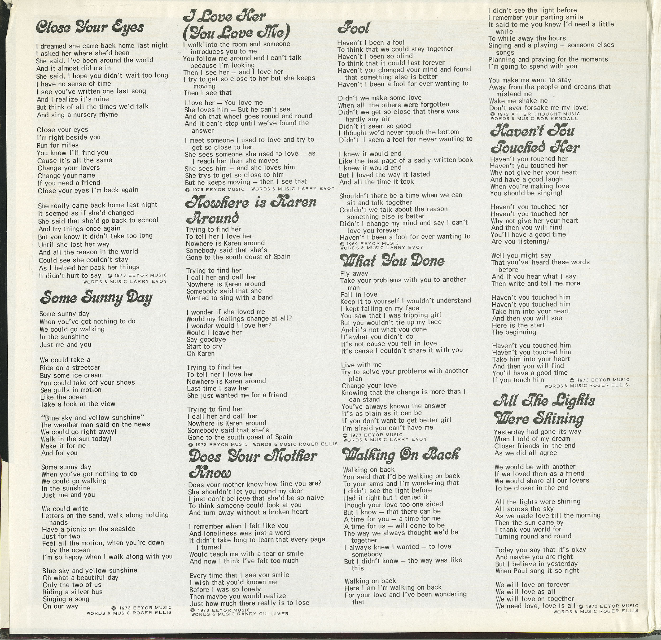 "Close Your Eyes" is a 1973 hit song recorded by Canadian trio Edward Bear. It was the lead single released from their fourth and final studio album, Close Your Eyes and was the biggest hit from the LP. The song was written by Larry Evoy, and was a sequel to their best-known hit, "Last Song".