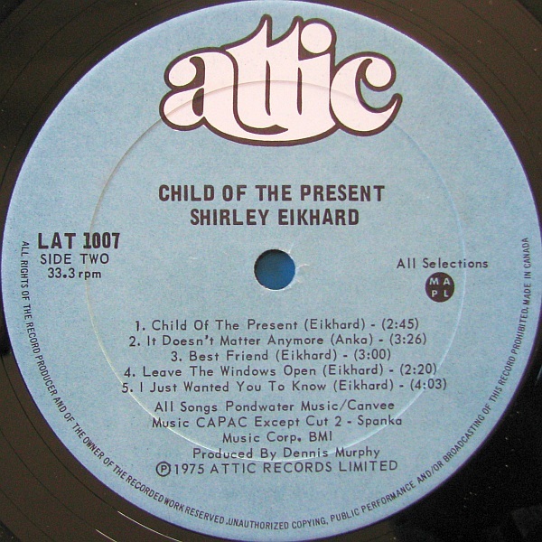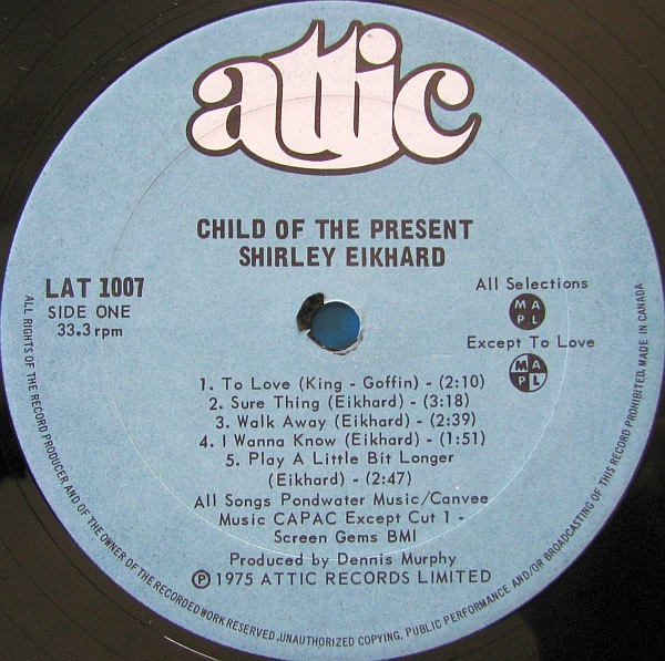 Child of the Present is a studio album by Canadian singer/songwriter Shirley Eikhard, released in 1975. The album yielded the top-40 singles "Play A Little Bit Longer," "Sure Thing," and "I Just Wanted You To Know," and earned Eikhard comparisons to Carole King and Anne Murray. Eikhard has written for Cher, Bonnie Raitt, Kim Carnes, Rita Coolidge, Emmylou Harris, The Pointer Sisters, George Fox, Catherine McKinnon, Alannah Myles, Peter Pringle, and Sylvia Tyson, among more than a dozen others. Bonnie Raitt's rendition of Eikhard's song "Something To Talk About" won a Grammy in 1991.