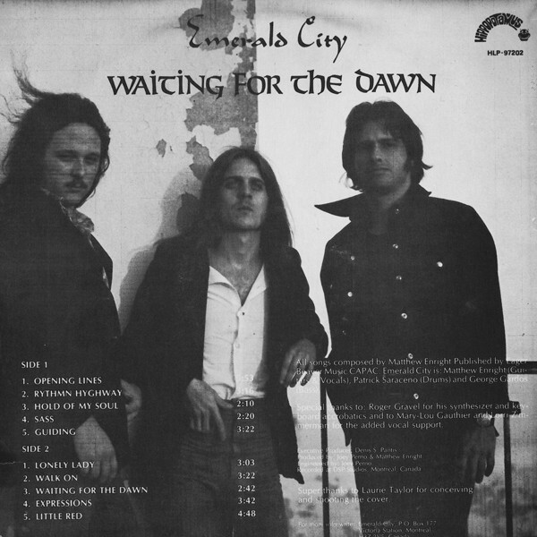 Emerald City performed live in nine of the ten Provinces of Canada, as well as in a handful of towns in upstate New York. In '96, after much demand, Waiting for the Dawn was reissued on vinyl and distributed in Canada, the USA, the UK and Europe. The supporting vocalists on the original studio LP were two singers who were part of a female Canadian pop vocal trio called Toulouse (Lori Zimmerman and Mary-Lou Gauthier), who had a string of pop hits in the 70’s. Mary-Lou went on to become the most known singing voice on Canadian big retail store advertisements. She also started working as a singer in Celine Dion’s recording and stage band in the 80’s. She is now living in Las Vegas and is still an important singing voice in Celine’s Vegas show band.