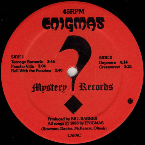 By late 1982, the Enigmas began touring into Alberta, Saskatchewan, and Manitoba, garnering a wider following as the group performed in front of new audiences. The band self-produced a five-song, eponymous EP in 1983, which included unusually high-quality production and the cult-favorite track Teenage Barnacle. More of a "learning process" than a serious project, the Enigmas were eager to record another EP. After touring the West Coast they recorded Strangely Wild in 1985, after enticing Zulu Records to release the record. To promote the release, the Enigmas toured out to Montreal with NoMeansNo and appeared on the compilation albums It Came from Canada, Vol. 1 and It Came From The Pit. However, by 1986 after Olinek left the band the group disbanded to work on other projects including The Scramblers, Earthling and TT Racer.