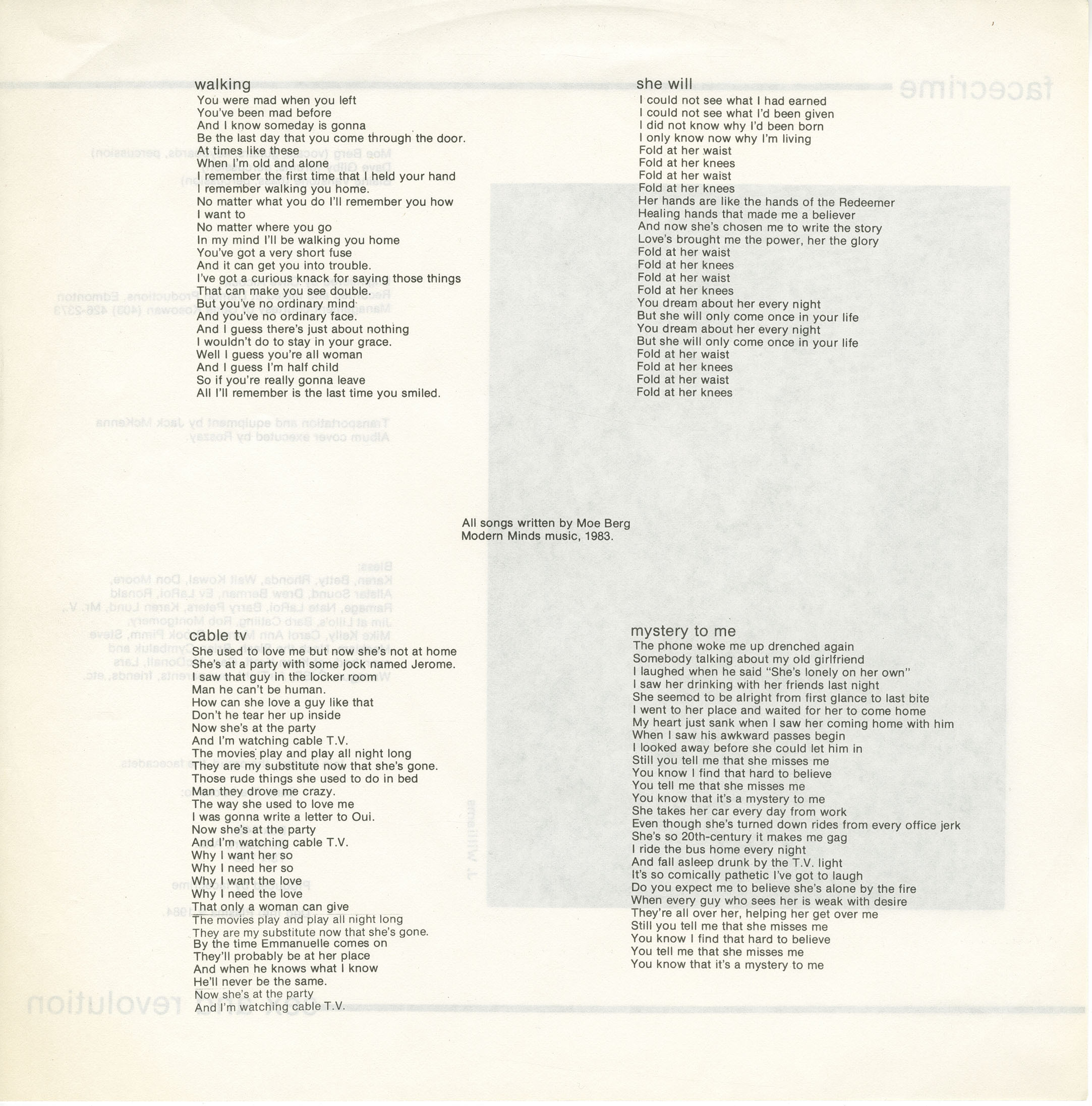 All songs written by Moe Berg for Modern Minds Music, 1983