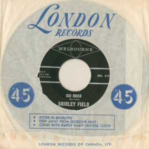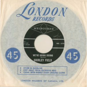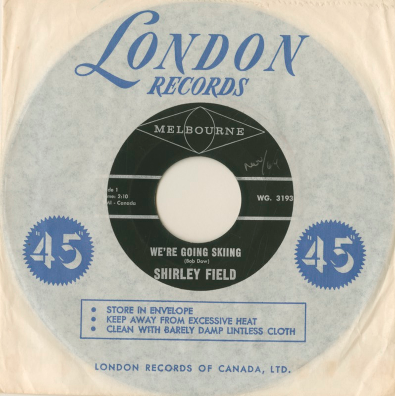 Throughout the 1960s, Shirley recorded a string of releases for the Rodeo/Banff and Melbourne labels — five singles in total between 1963 and 1969, alongside two full-length albums: The Two Sides of Shirley Field (Rodeo RBS-1186, 1963) and Yours Sincerely (Banff RBS-5309, 1969). Among her most collectible records is the 1965 Melbourne single “We’re Going Skiing” b/w “Ski Rock” (WG-3193), a rockabilly-inspired novelty cut that became a ski lodge favourite across Western Canada and remains a sought-after 45 among collectors today.